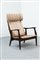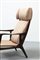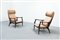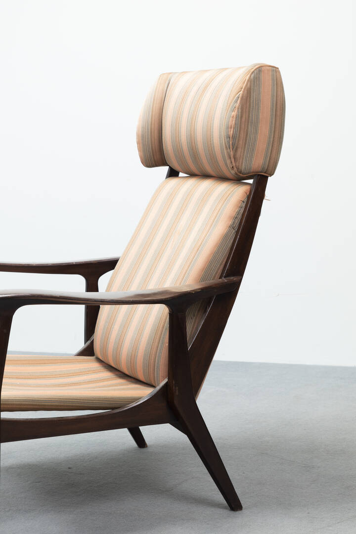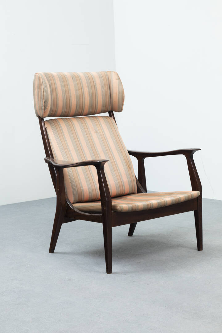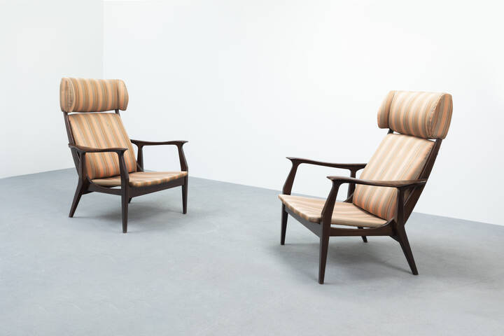 Coppia di poltrone con struttura in legno, imbottitura rivestita in tessuto a righe.