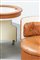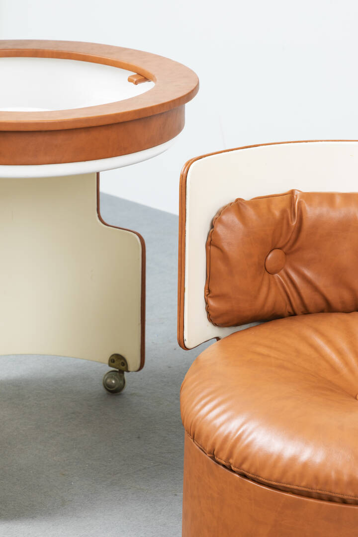 Poltroncina-toeletta in compensato curvato rivestito in cuoio.