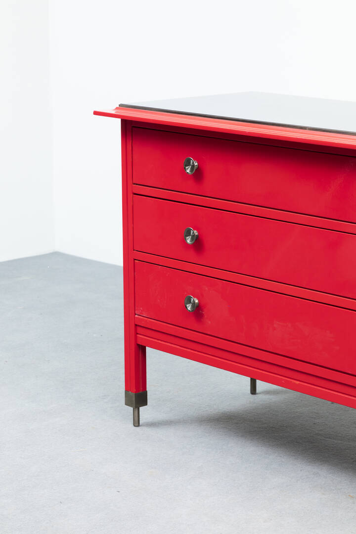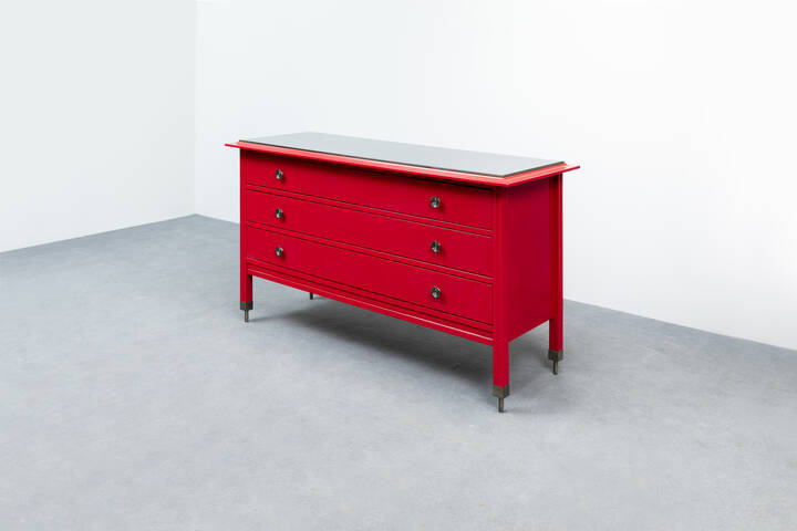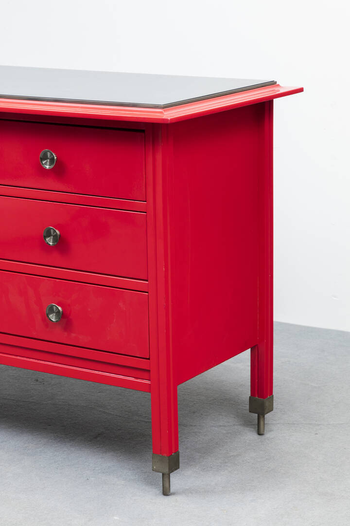 Cassettone in legno laccato con pomelli e puntali in ottone, piano opalino.
