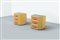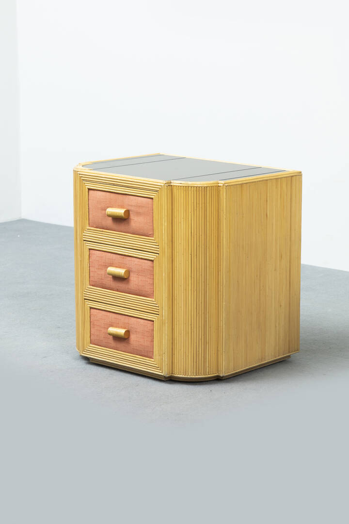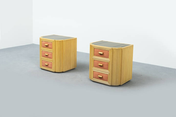 Coppia di comodini in giunco, piano in vetro specchiato.