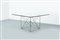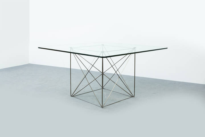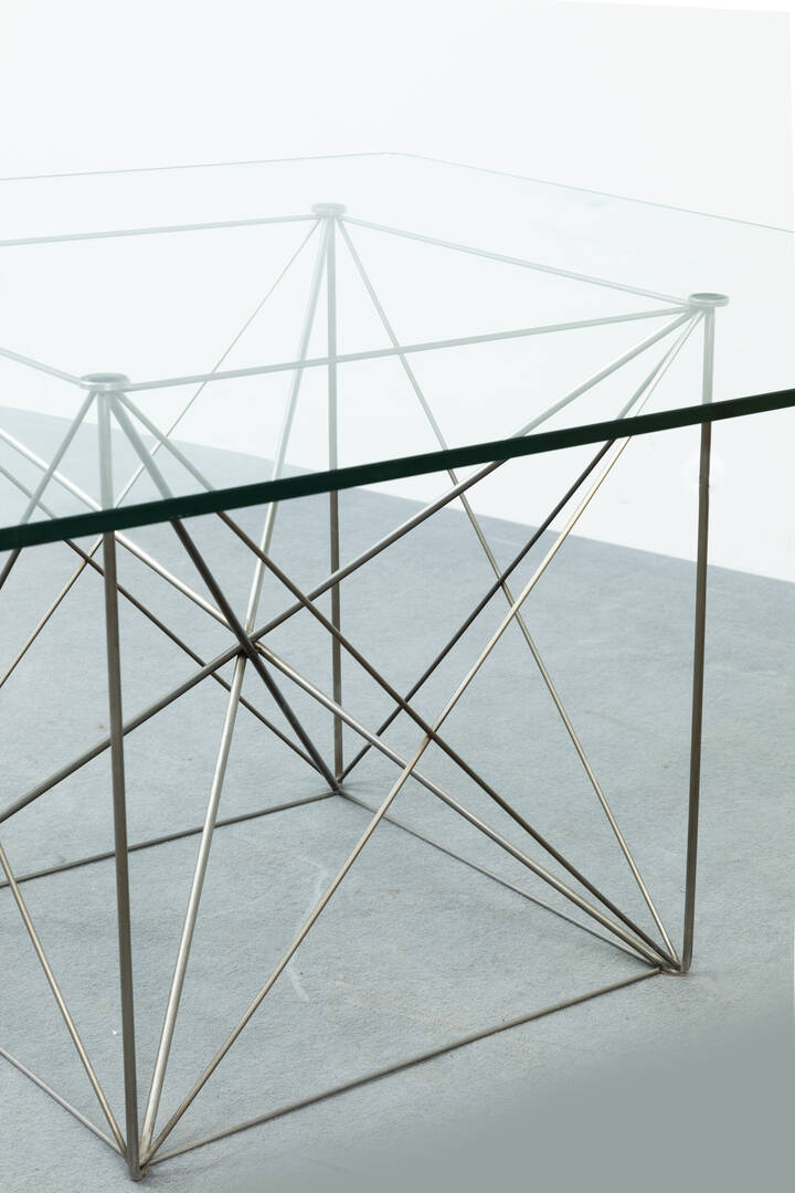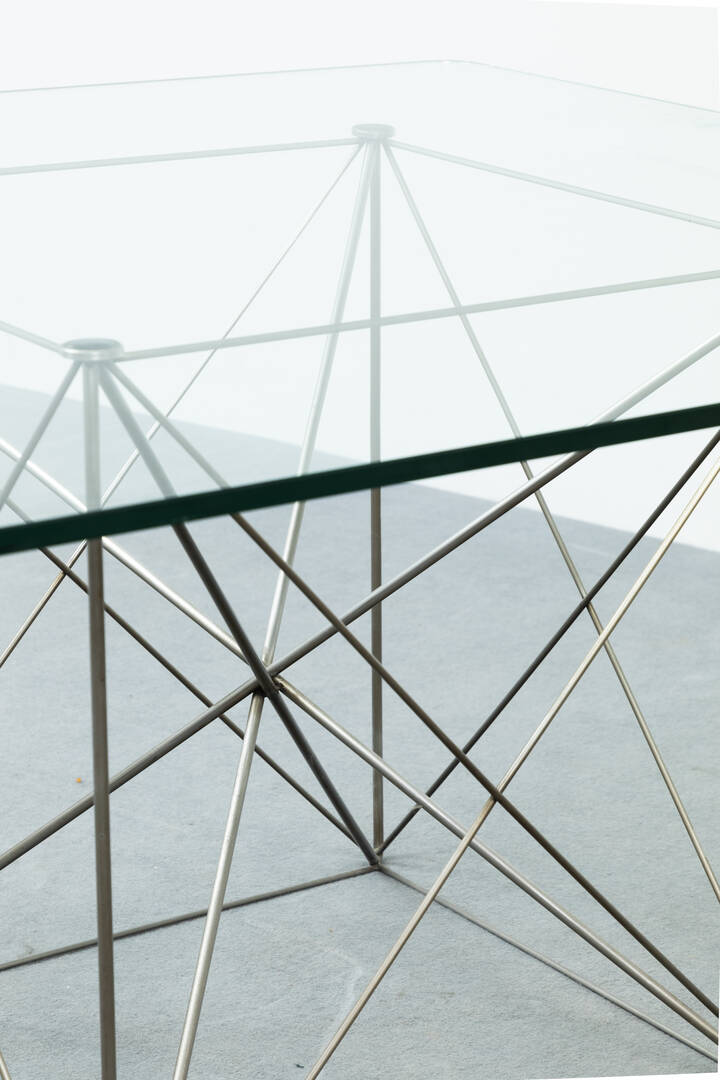 Tavolo con struttura in tondino di metallo cromato, piano in vetro di forte spessore.