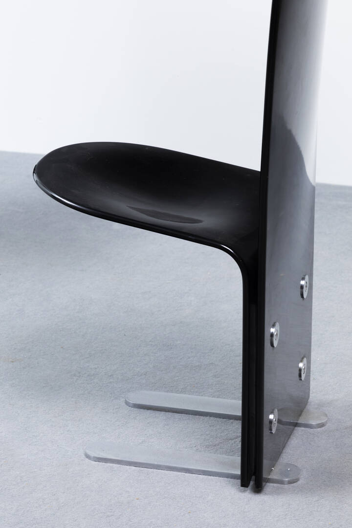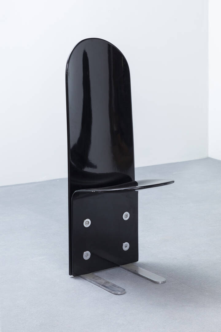 Compensato curvato e laccato, piedi in acciaio cromato.