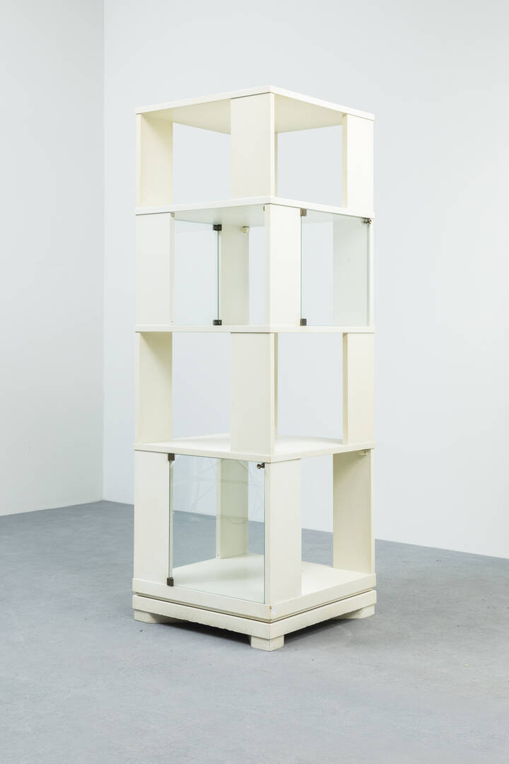 Libreria girevole in legno di noce laccato con ante in cristallo.