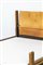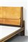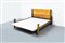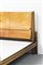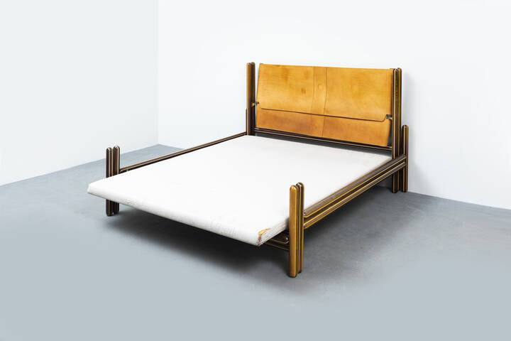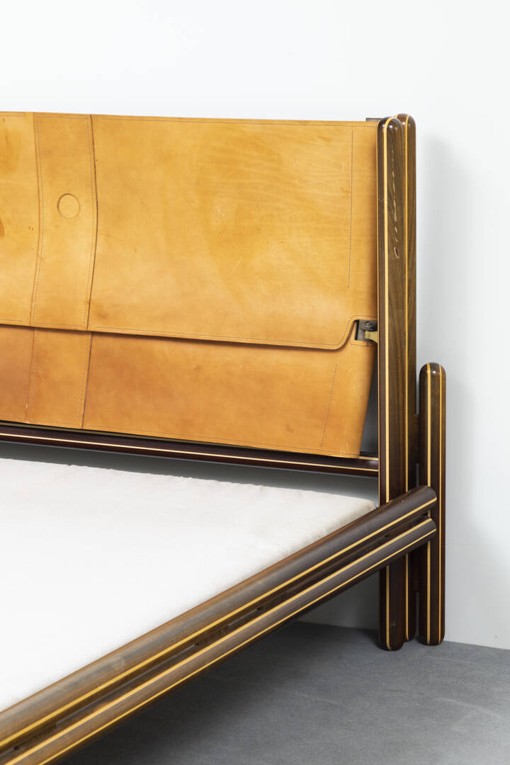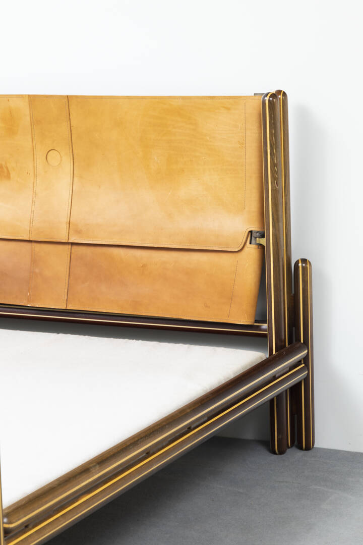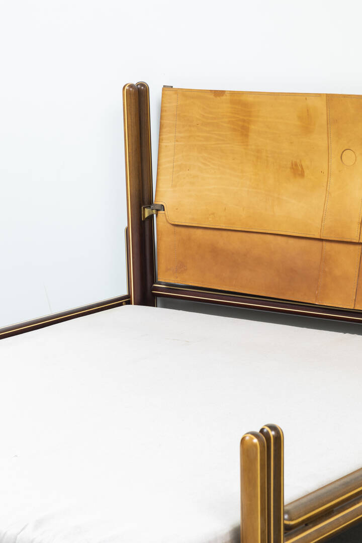 Struttura portante in legno massello con inserti in legno chiaro, testiera in cuoio, particolari in ottone.