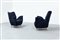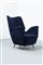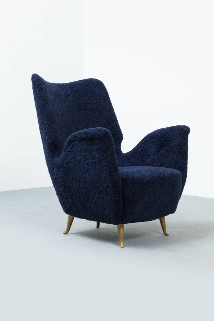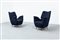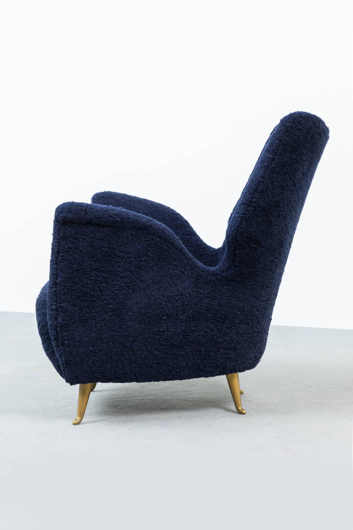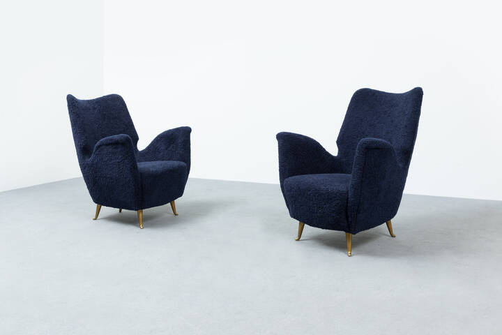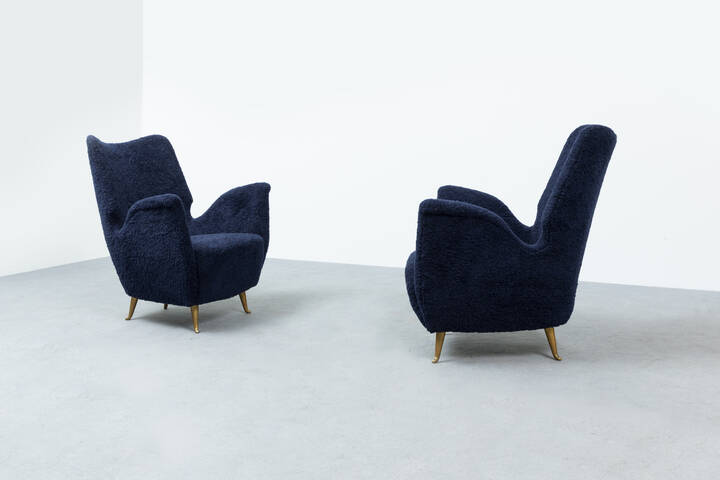 Coppia di poltrone con imbottitura rivestita in tessuto, gambe in legno.