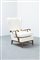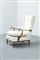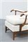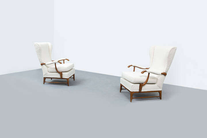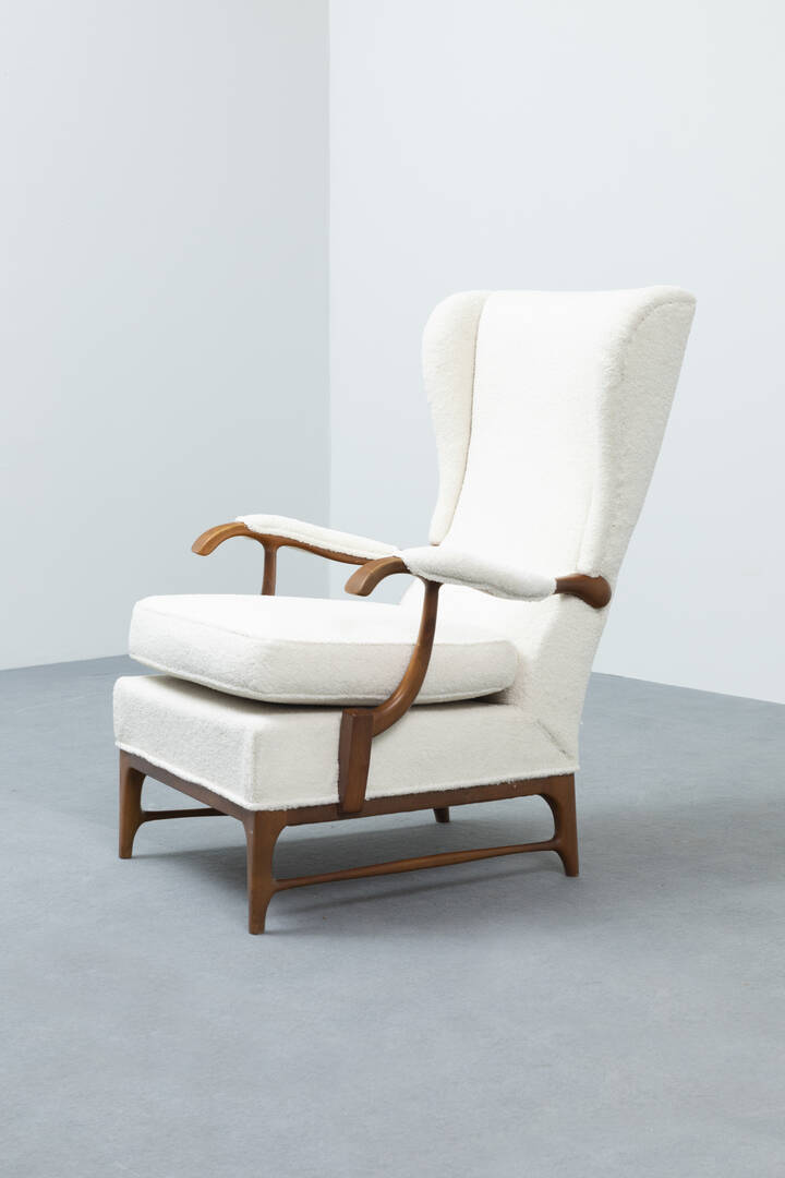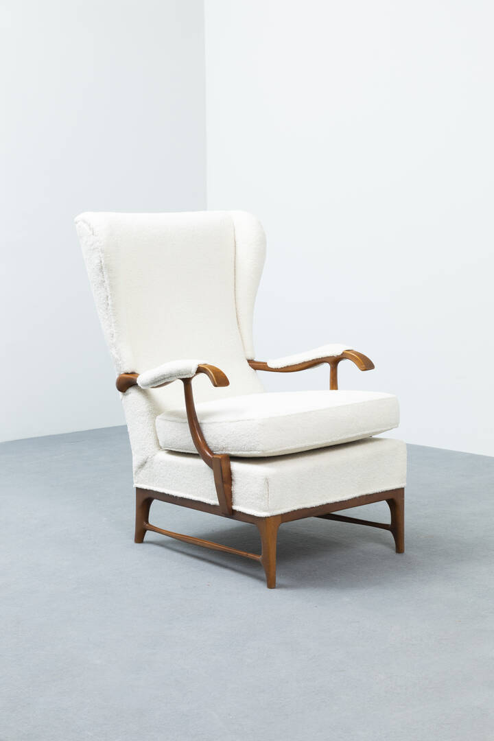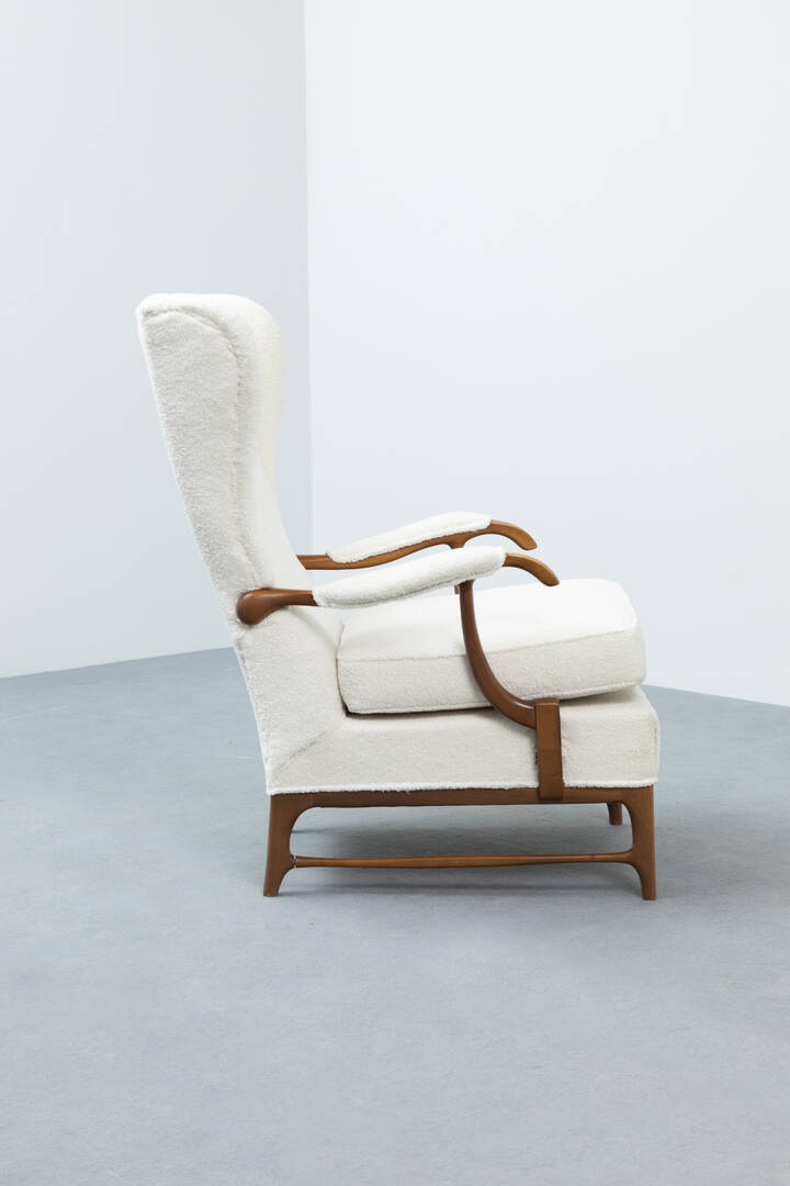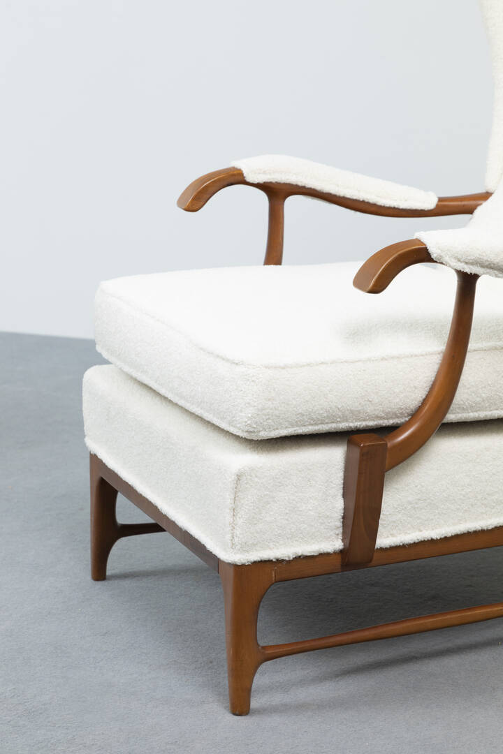 Coppia di poltrone con struttura in legno, imbottitura rivestita in tessuto bouclé.