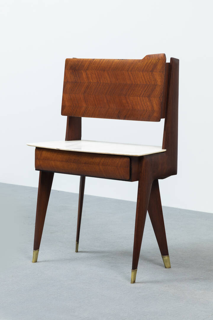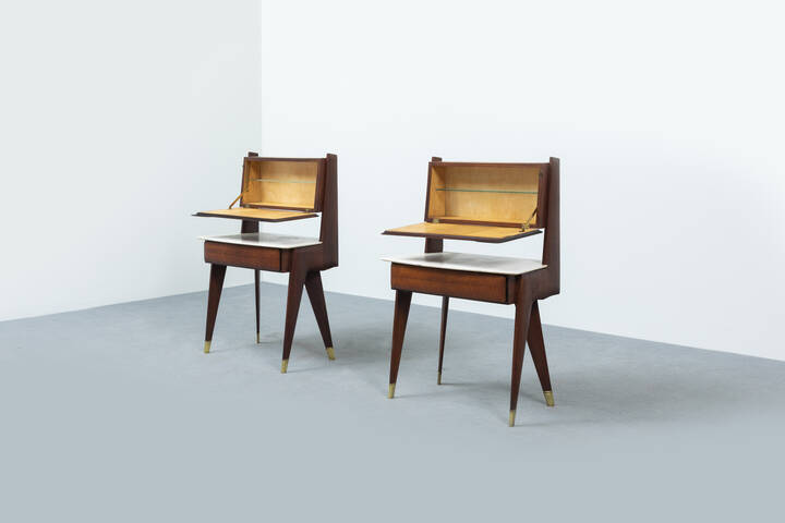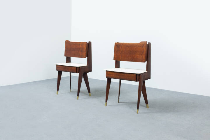 Coppia di comodini in legno di mogano, piano in marmo bianco, piedi in ottone.