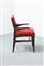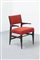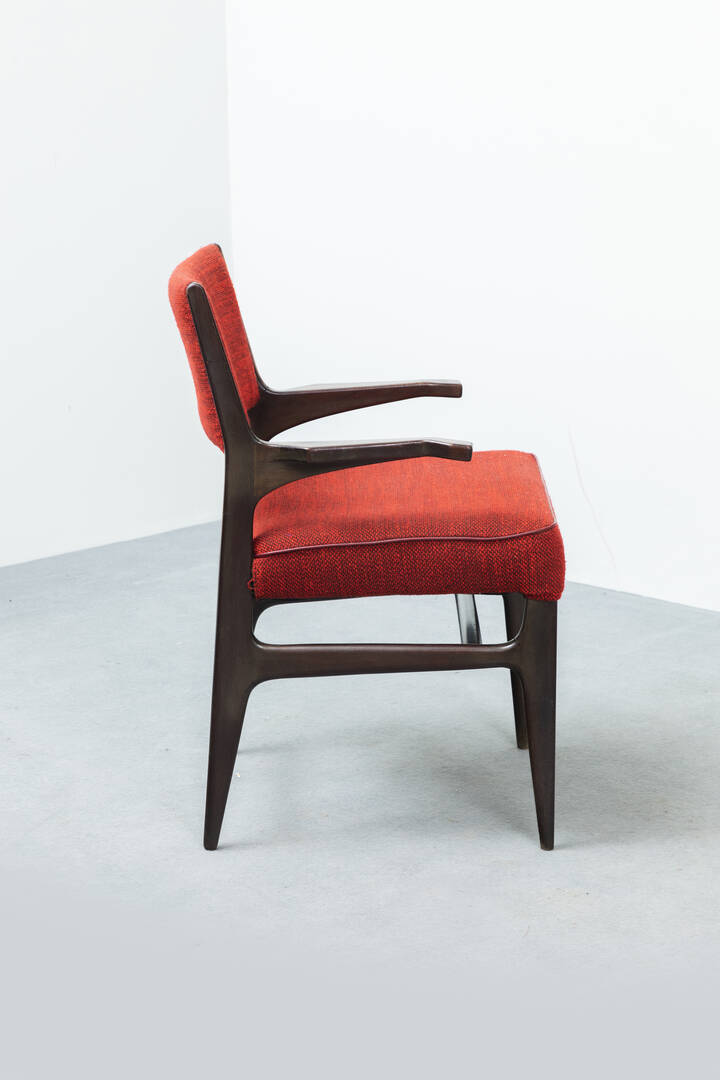 Poltroncina in legno di mogano, seduta e schienale imbottiti rivestiti in tessuto.