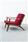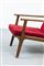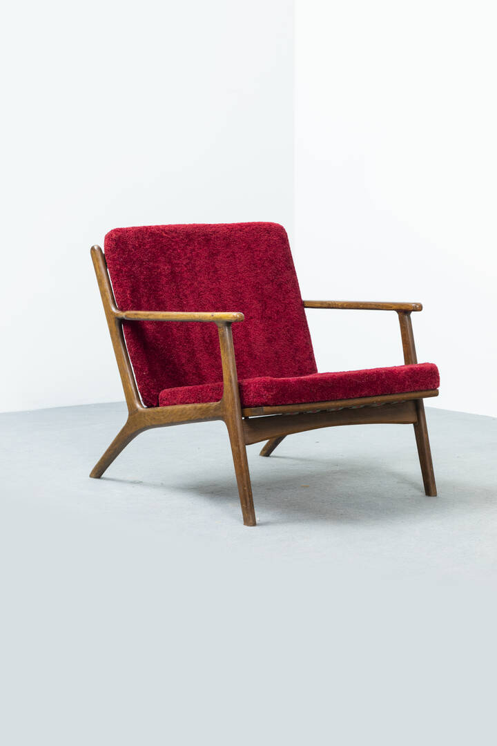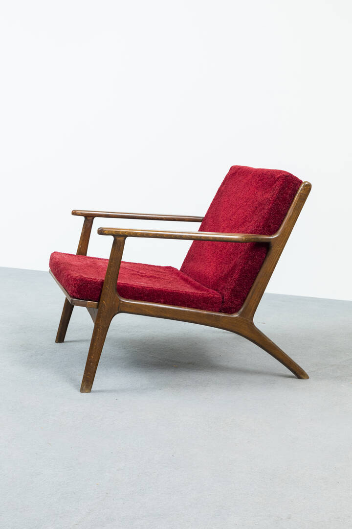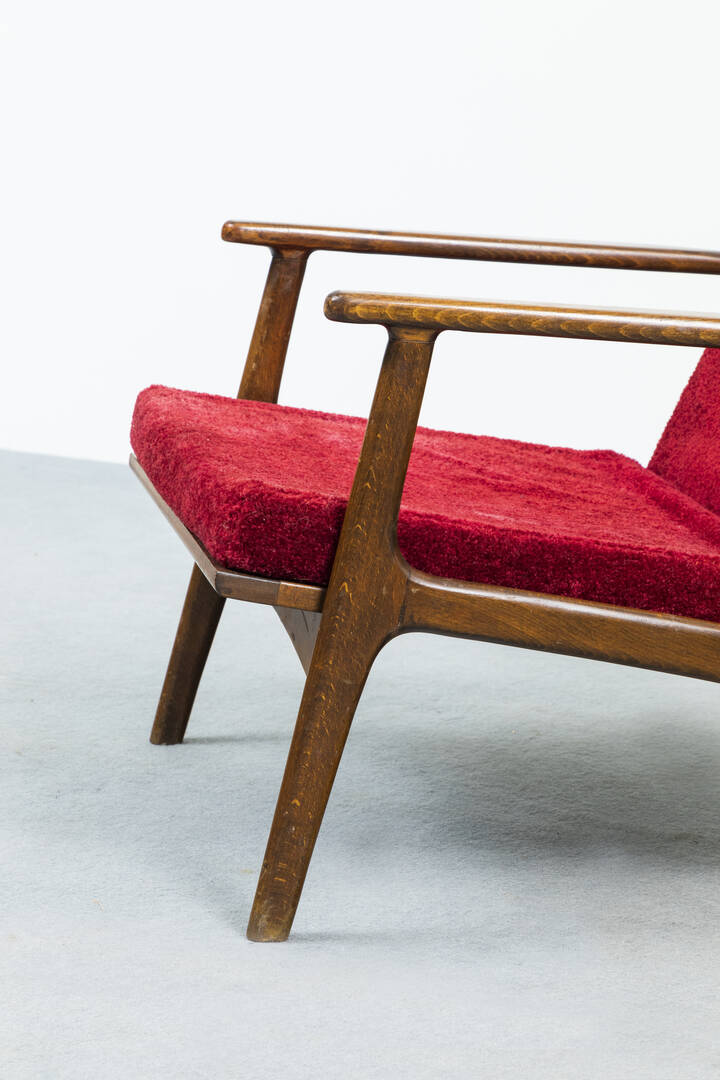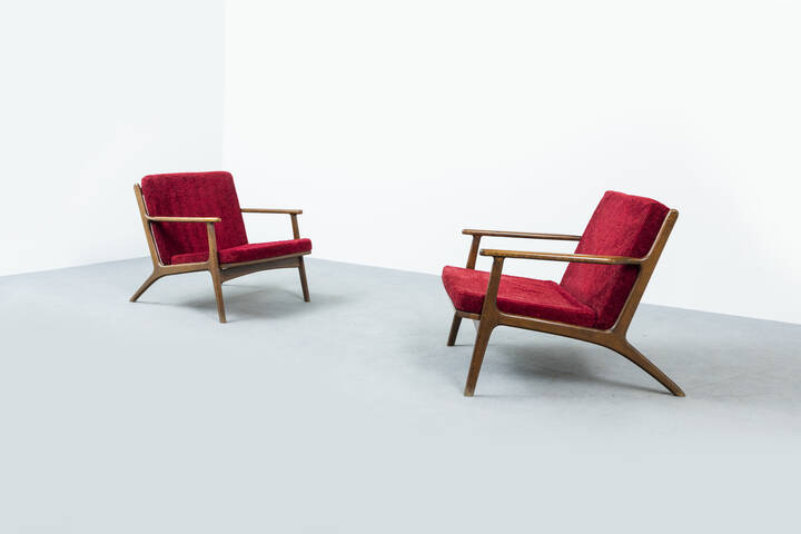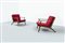 Coppia di poltrone con struttura in legno, cuscini imbottiti rivestiti in tessuto.