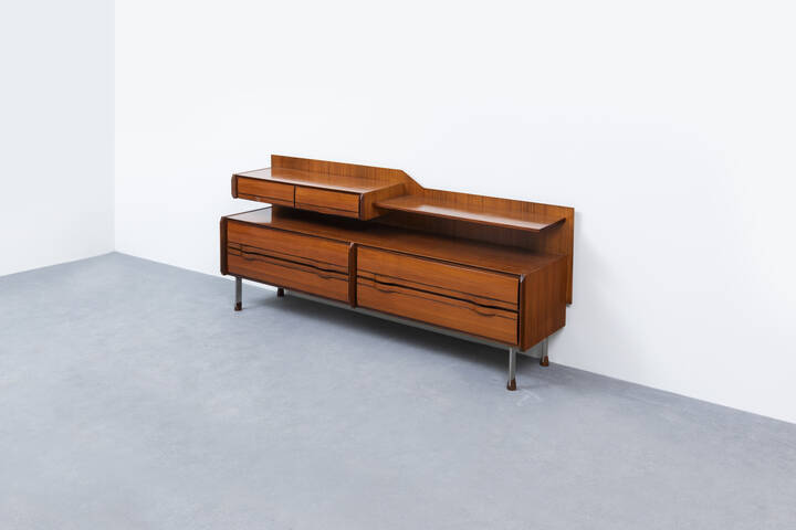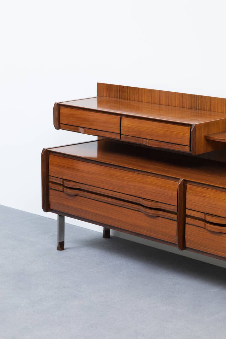 Mobile contenitore a quattro cassetti, alzata a due tiretti e piano in legno.
