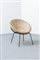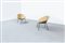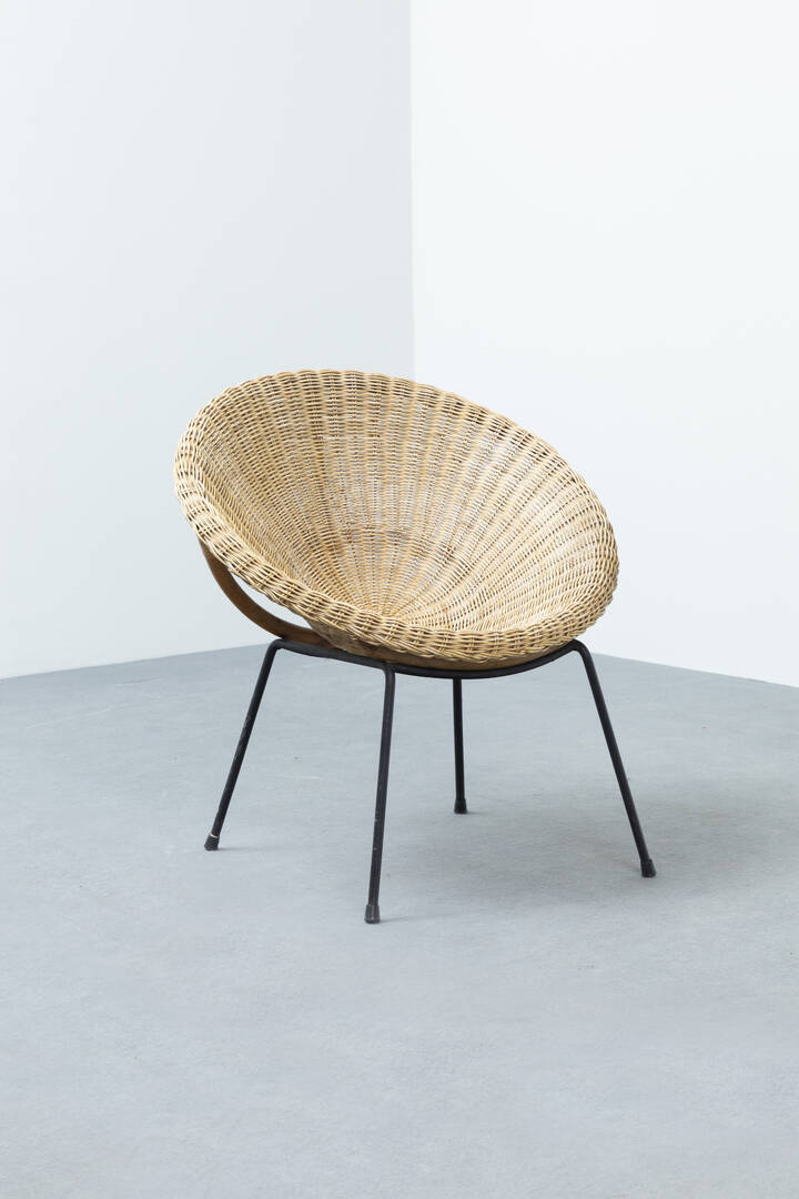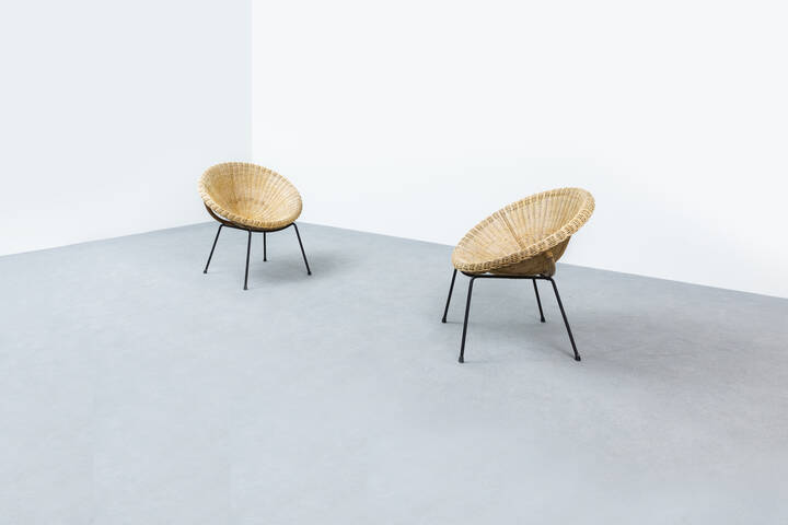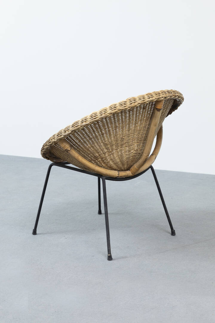 Coppia di poltrone con struttura in tubolare metallico verniciato, seduta in vimini intrecciato.