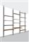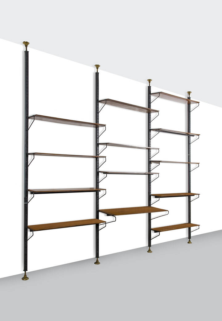 Libreria con montanti in metallo laccato, terminali in ottone, piani in legno.