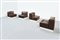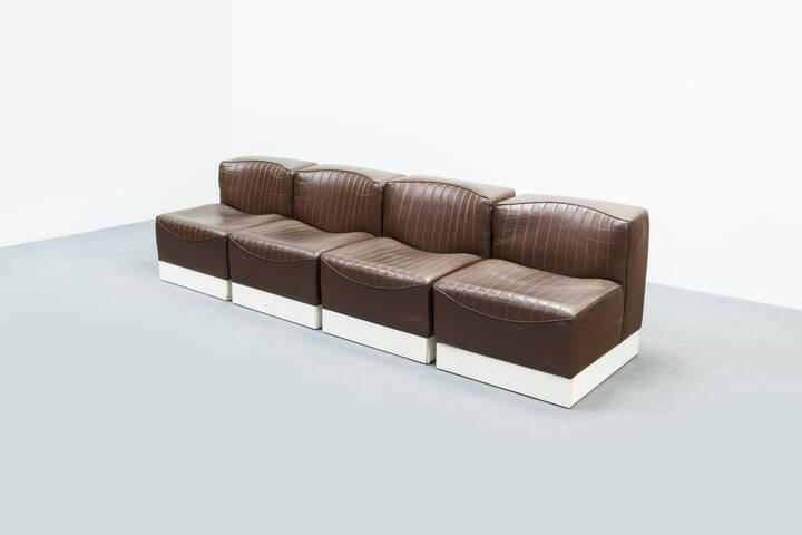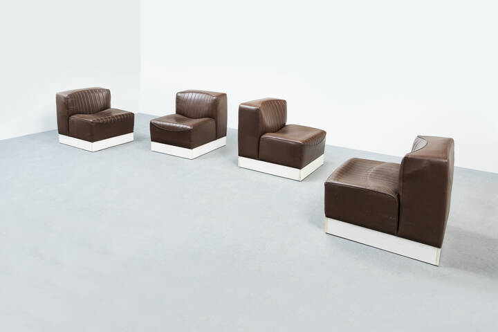 Quattro poltrone in legno laccato, imbottitura rivestita in pelle.