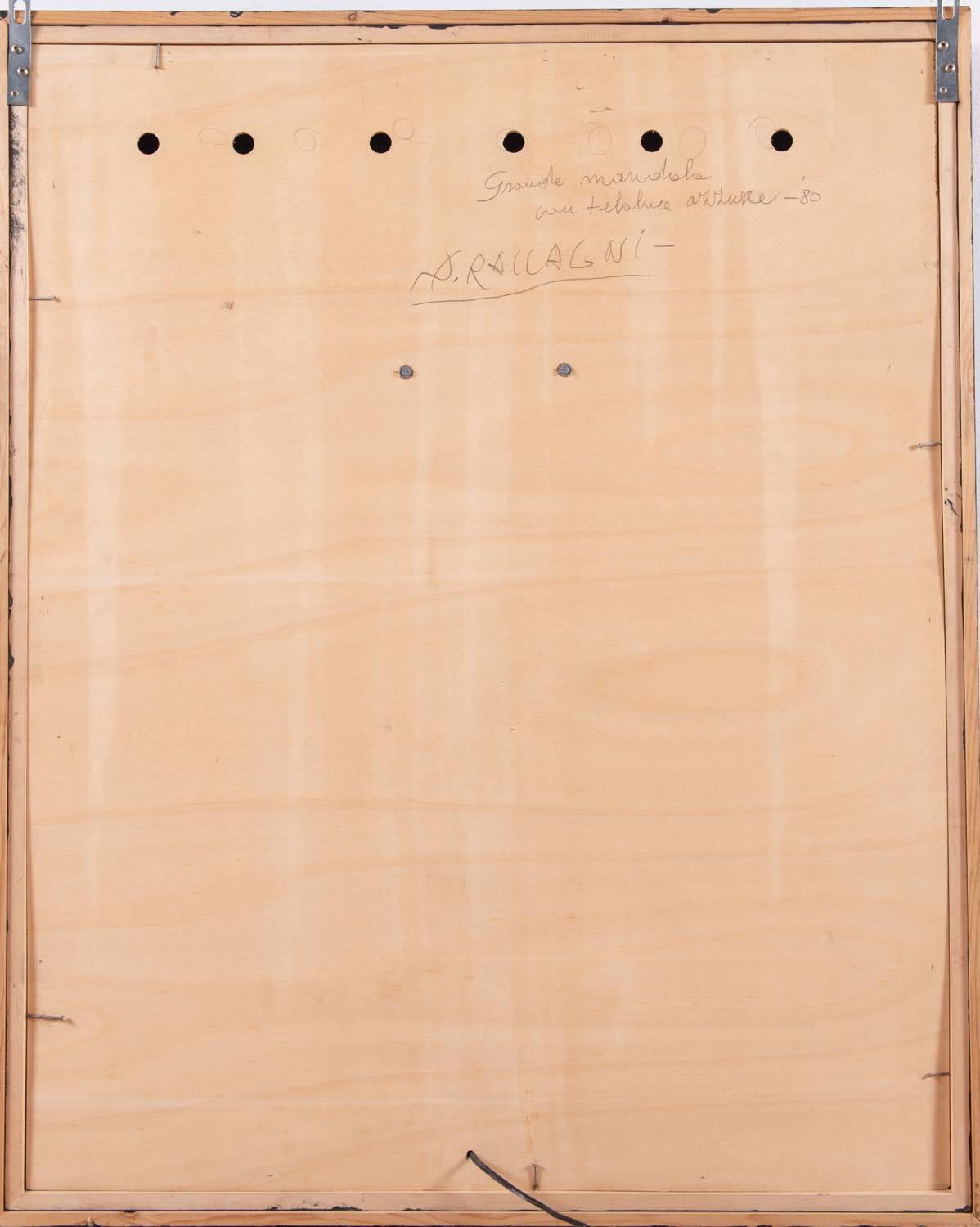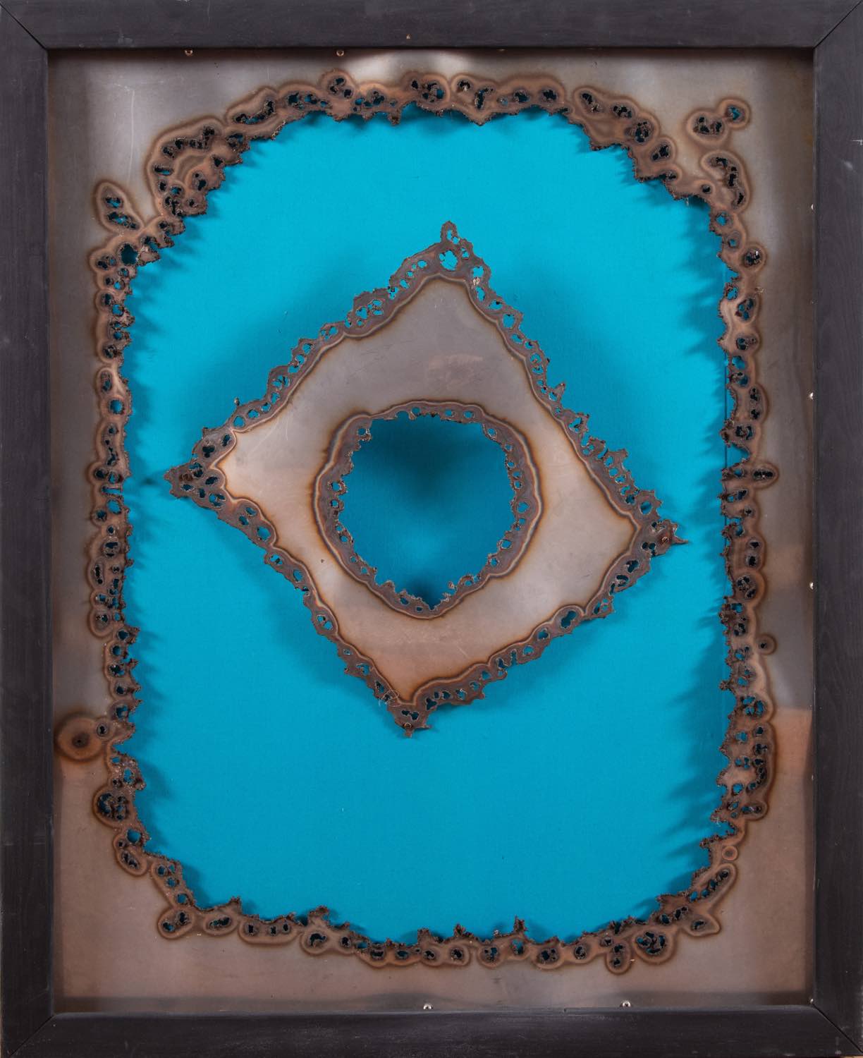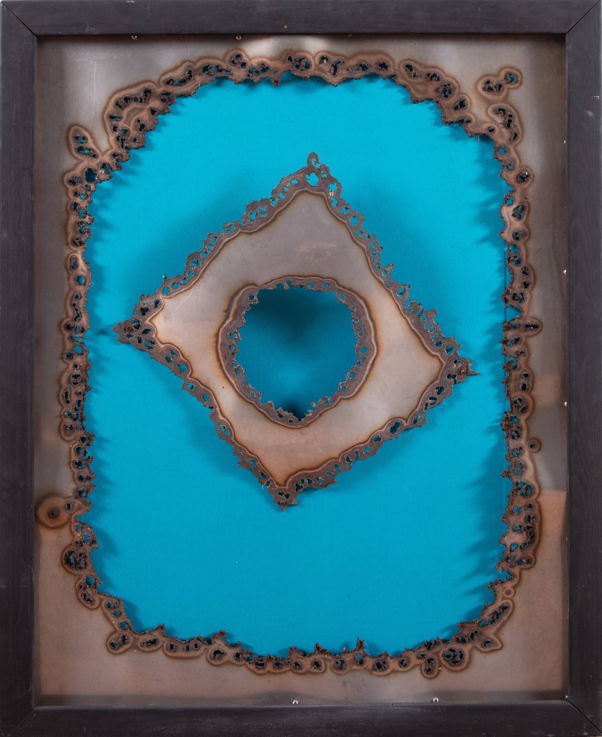 Andrea Raccagni (Imola 1921 - 2005), “Grande mandala con telaluce azzurra”, 1980. Ferro e tela applicati su tavola elettrificata, al retro reca iscrizione con titolo, data e firma “Grande mandala/con telaluce azzurra - '80/A. Raccagni”, H cm 107x86.5