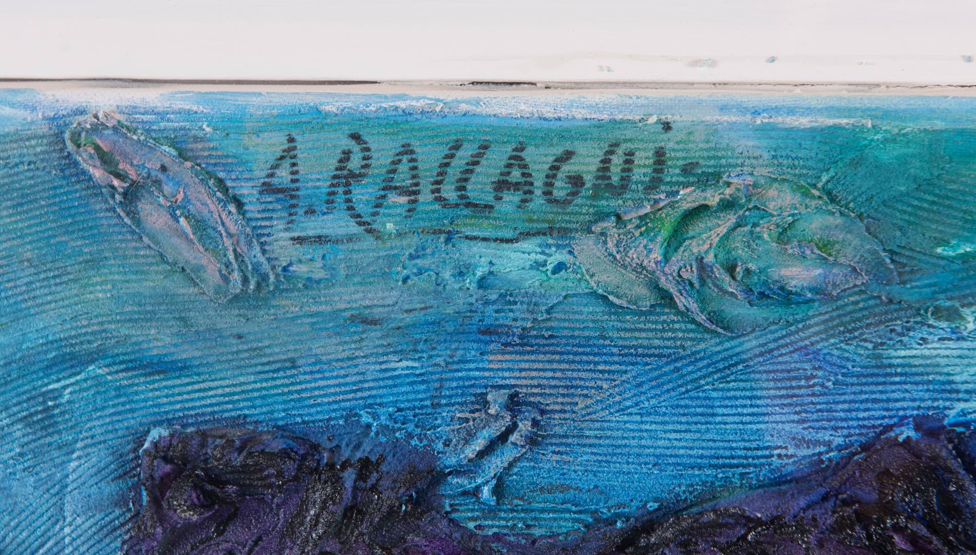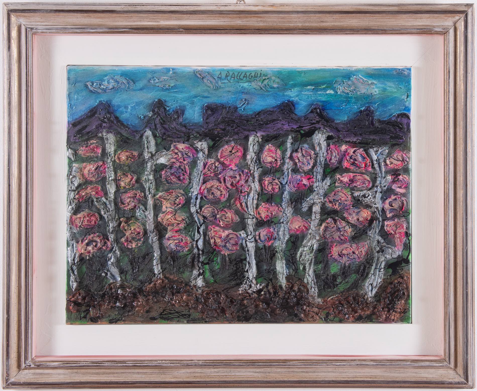 Andrea Raccagni, “Senza titolo”. Olio e tecnica mista su tela, firmata in alto al centro A. Raccagni, H cm 59x78 - con cornice H cm 90x109.5