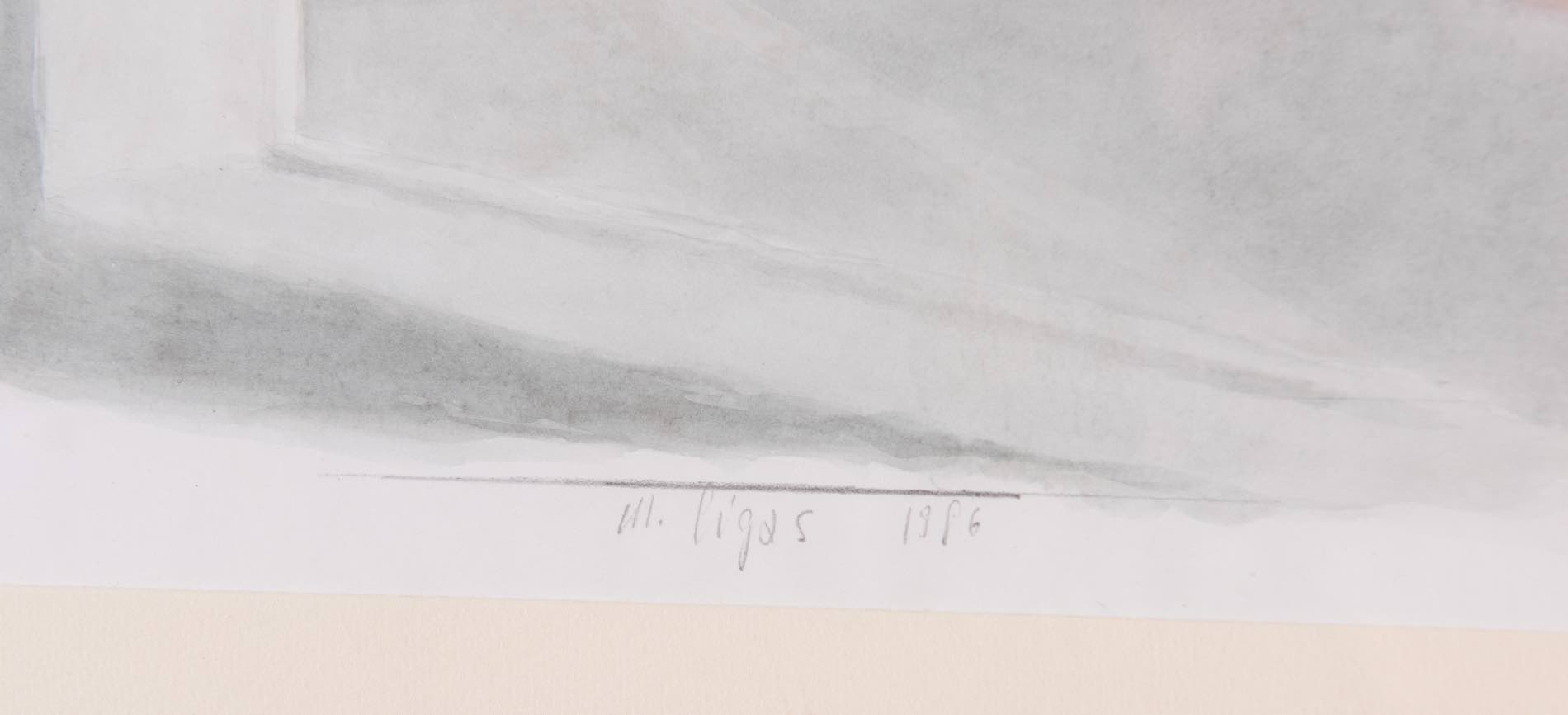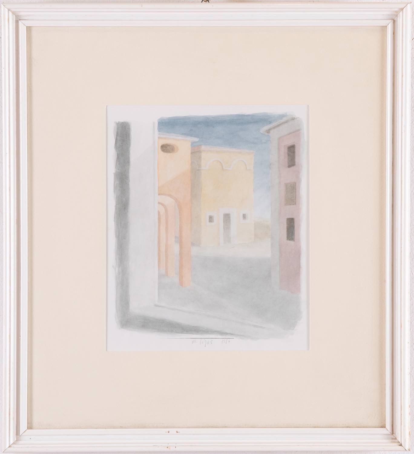 Maurizio Ligas (Treviso 1951 - Siena 2005), “Scorcio cittadino”, 1986. Acquerello su carta, firmato e datato in basso al centro M. Ligas 1986, H cm 27x23.5 - con cornice H cm 50x55