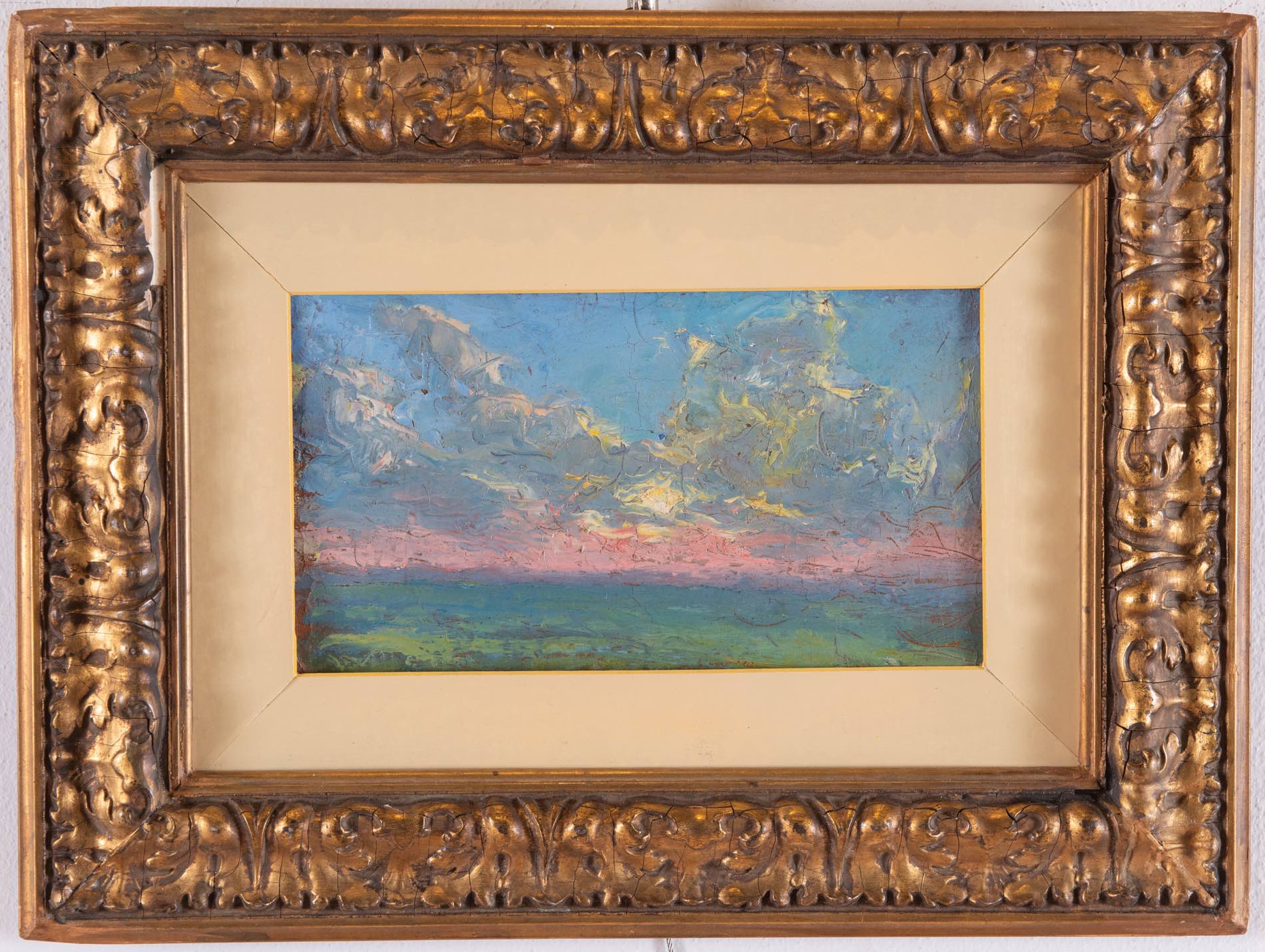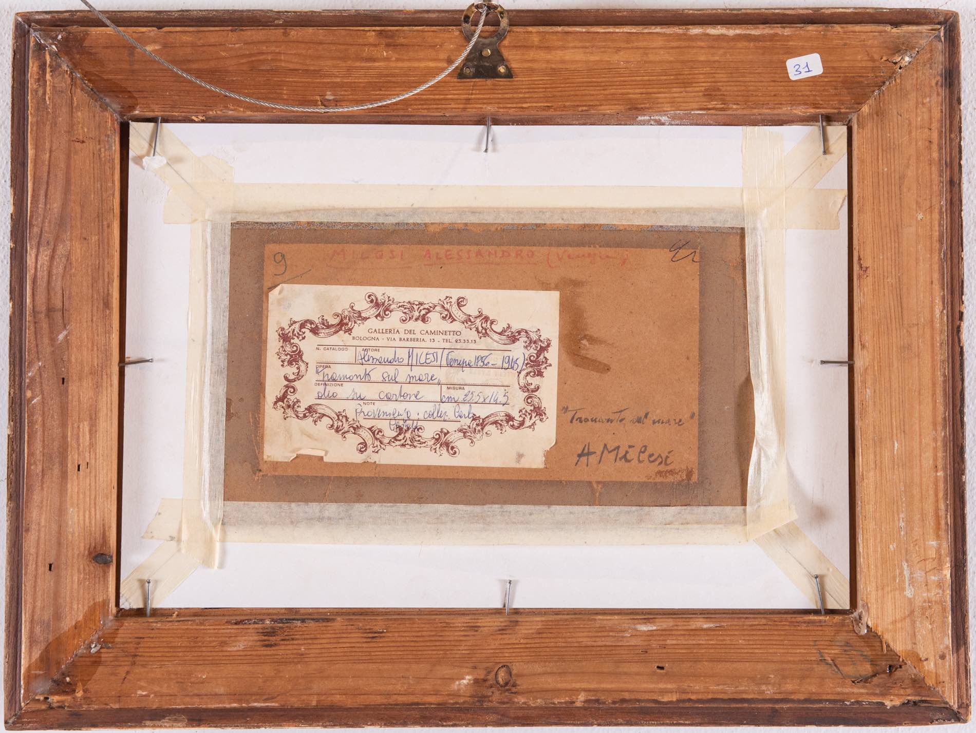 Alessandro Milesi (Venezia 1856 - 1945), “Tramonto sul mare”. Olio su cartone, titolato e firmato al retro 'Tramonto sul mare/A Milesi', reca al retro etichetta della Galleria del Caminetto - Bologna, H cm 14.5x25.5 - con cornice H cm 33x44