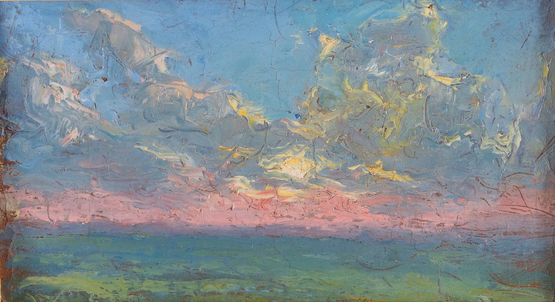 Alessandro Milesi (Venezia 1856 - 1945), “Tramonto sul mare”.Olio su cartone, titolato e