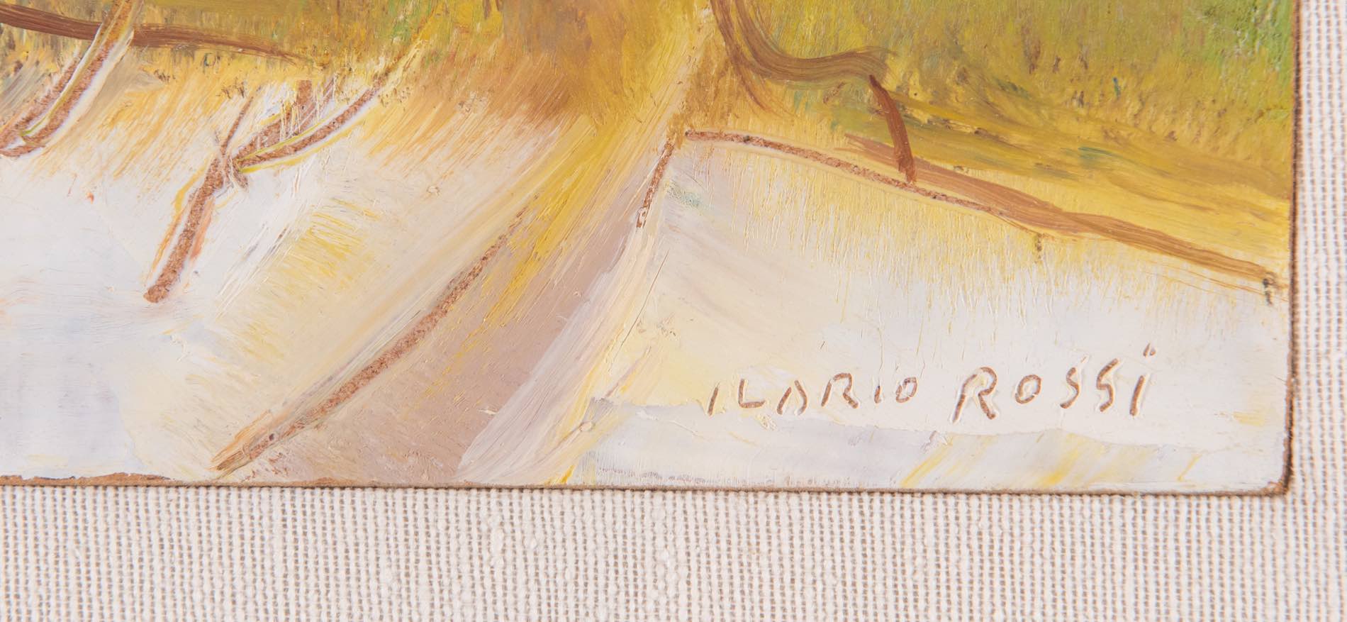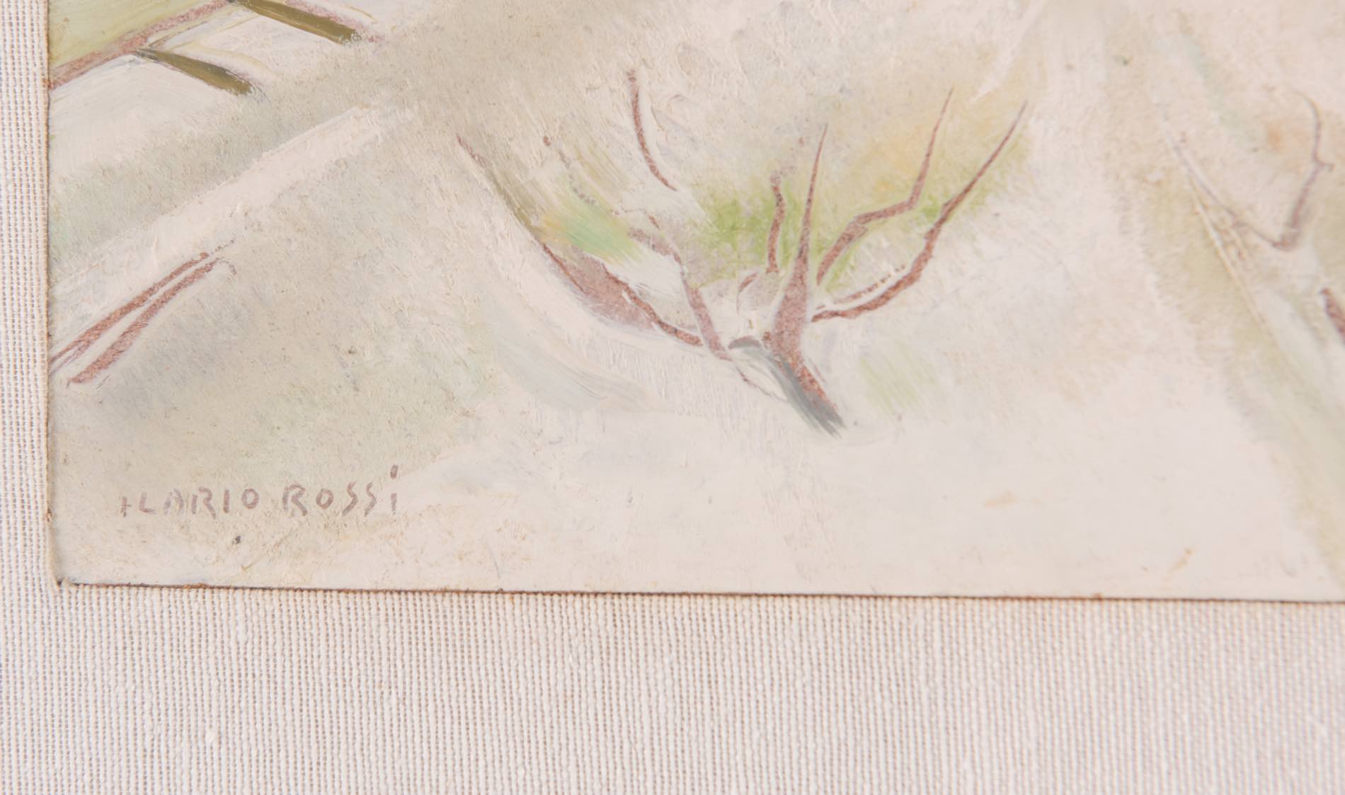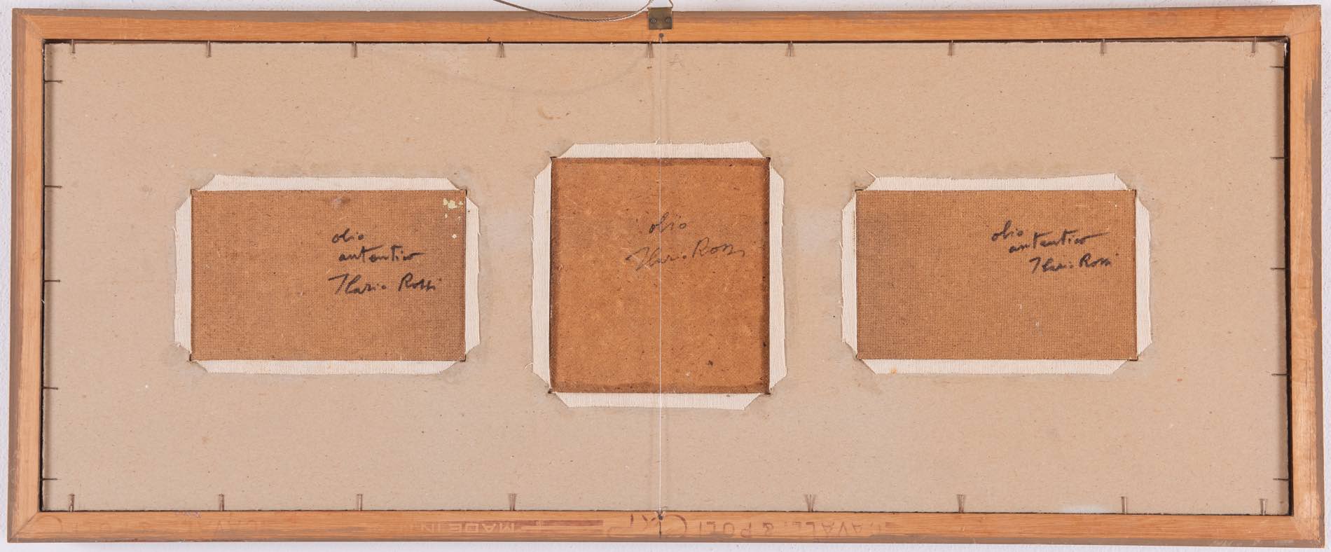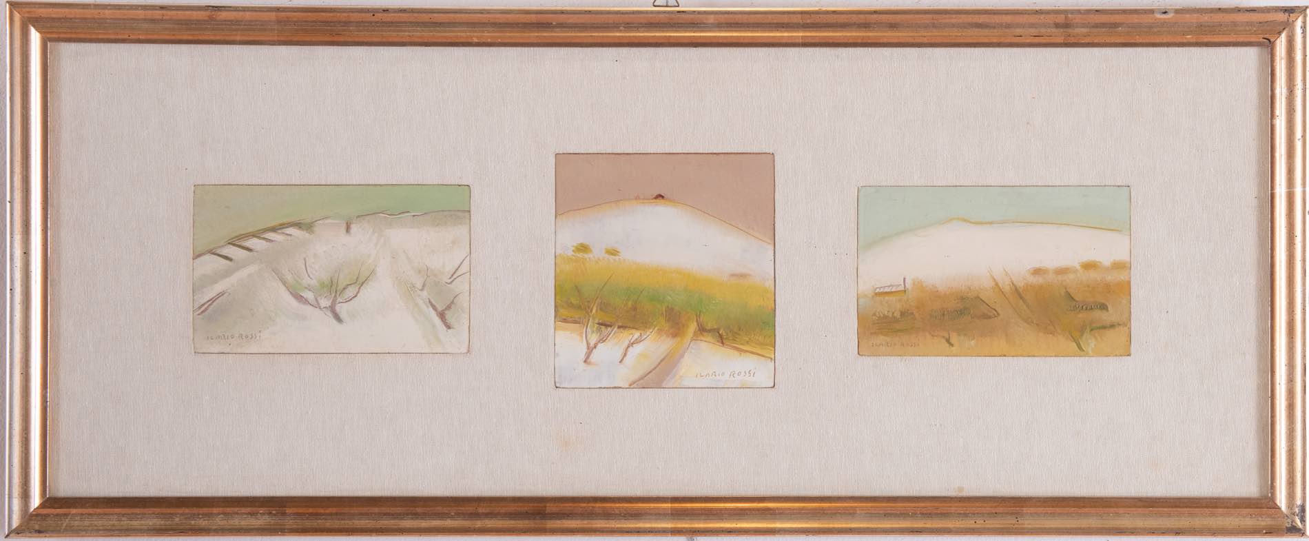 Ilario Rossi (Bologna 1911 - 1994), Lotto composto da tre olii su faesite raffiguranti “Paesaggi innevati”.A sinistra: firmato in basso a sinistra Ilario Rossi, al retro reca iscrizione 'olio/autentico/Ilario Rossi', H cm 11x18; Al centro: firmato in basso a destra Ilario Rossi, al retro reca iscrizione 'olio/Ilario Rossi', H cm 16x15; A destra: firmato in basso a sinistra Ilario Rossi, al retro reca iscrizione 'olio/autentico/Ilario Rossi', H cm 11.5x18, con cornice H cm 36x89