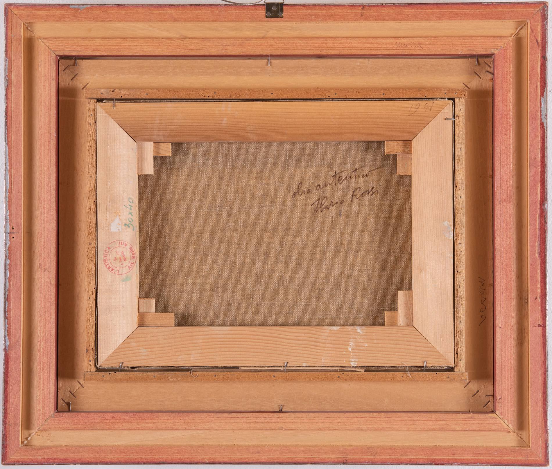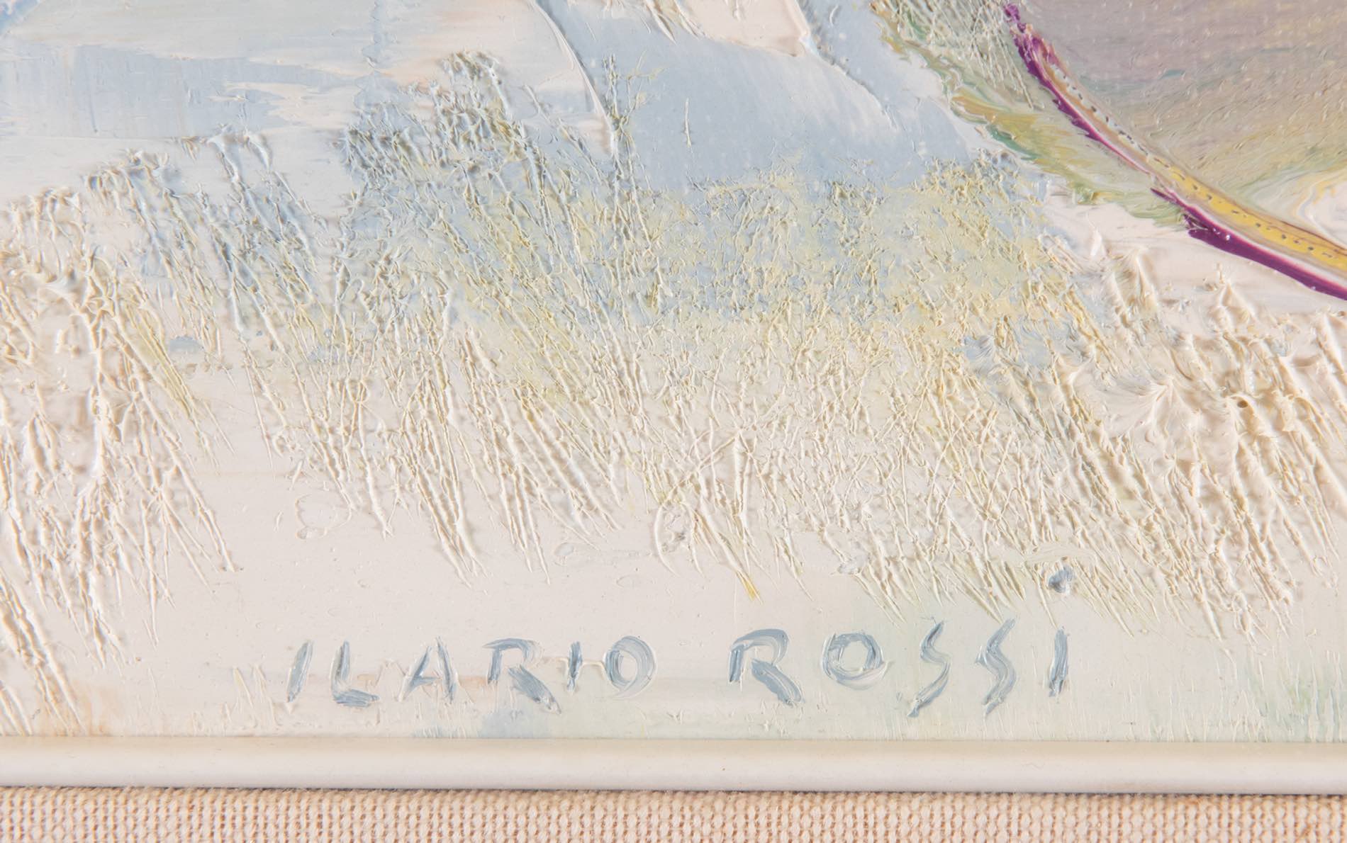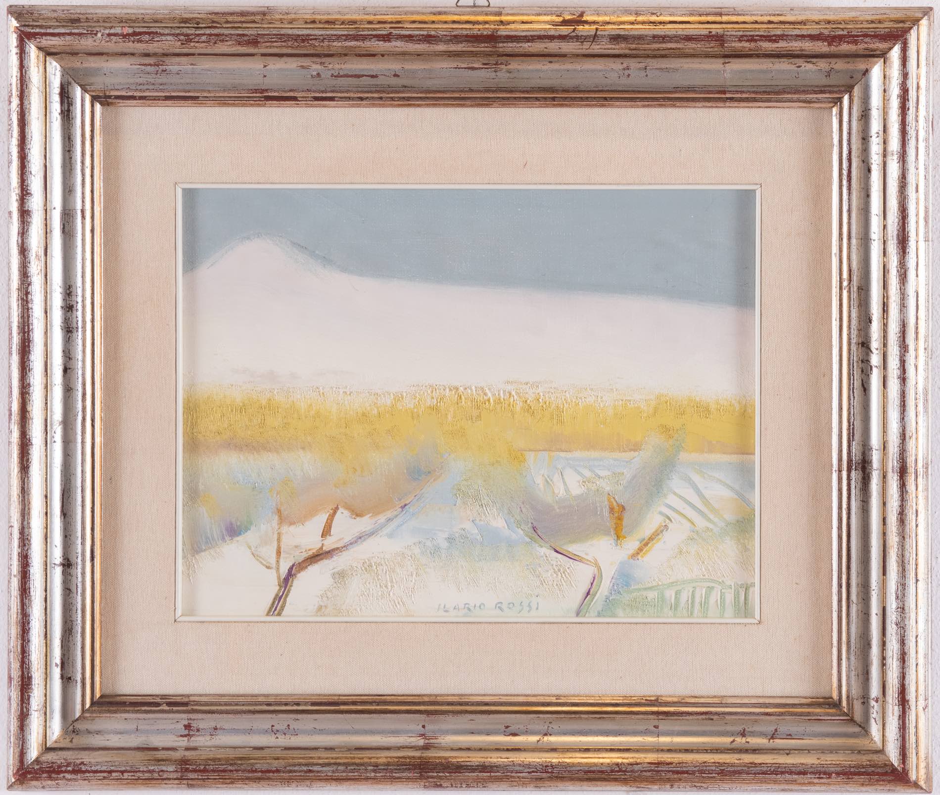 Ilario Rossi (Bologna 1911 - 1994), “Paesaggio innevato”. Olio su tela, firmato in basso al centro Ilario Rossi, reca al retro iscrizione per autentica 'olio autentico/Ilario Rossi', H cm 30.5x40 - con cornice H cm 22x61.5