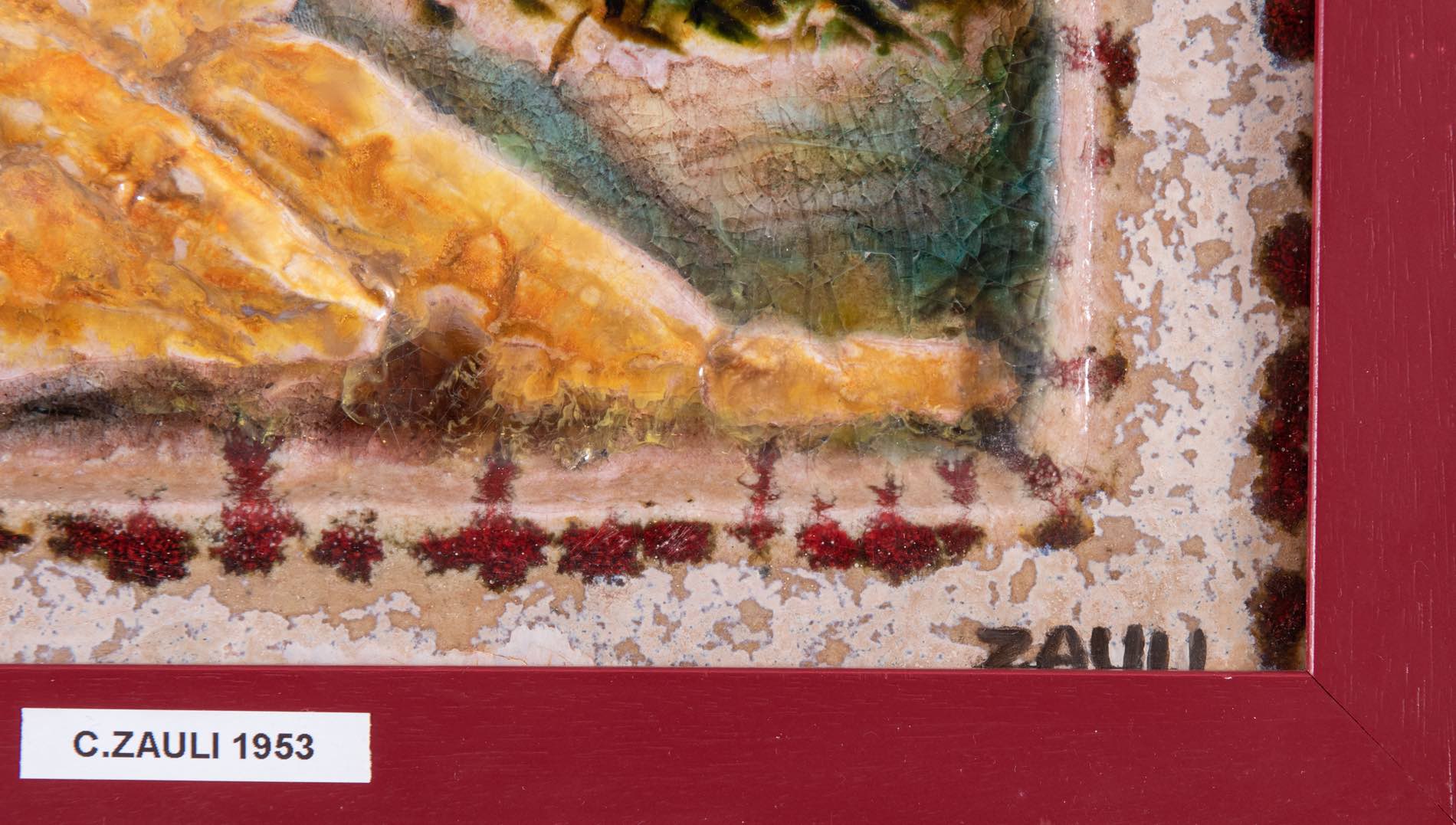 Carlo Zauli (Faenza 1926 - 2002), “Figura seduta con vasellame”. Placca in ceramica decorata in altorilievo e dipinta in policromia, H cm 53x38 (lievi usure)