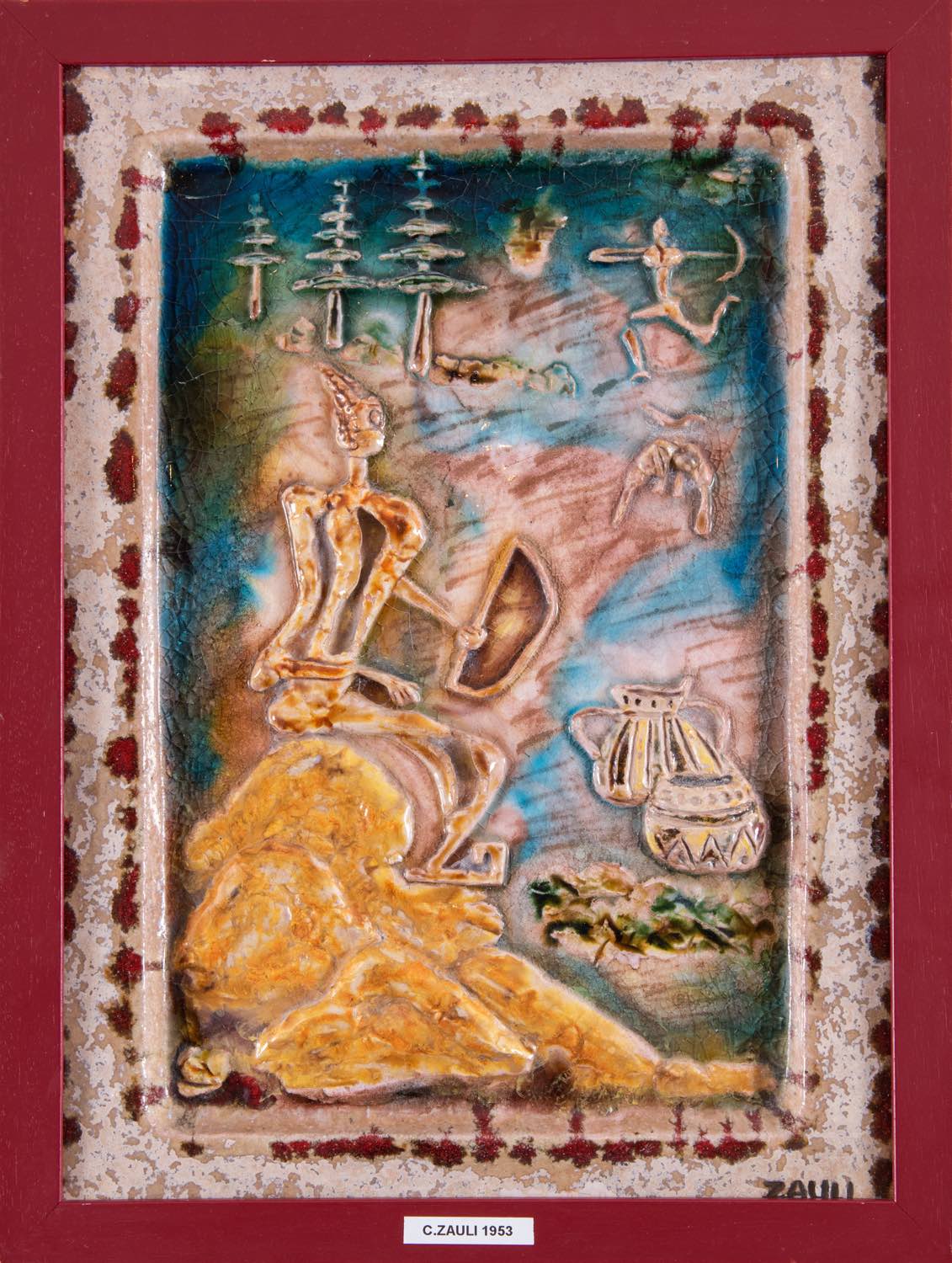 Carlo Zauli (Faenza 1926 - 2002), “Figura seduta con vasellame”.Placca in ceramica decorata in