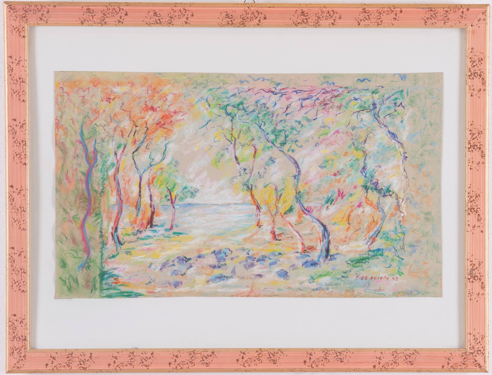 Francesco De Rocchi (Saronno 1902 - Milano 1978), “Paesaggio con alberi”, 1952. Disegno a pastelli su carta, firmato e datato in basso a destra F. De Rocchi 52, H cm 33.5x38 - con cornice H cm 55.5x72.5