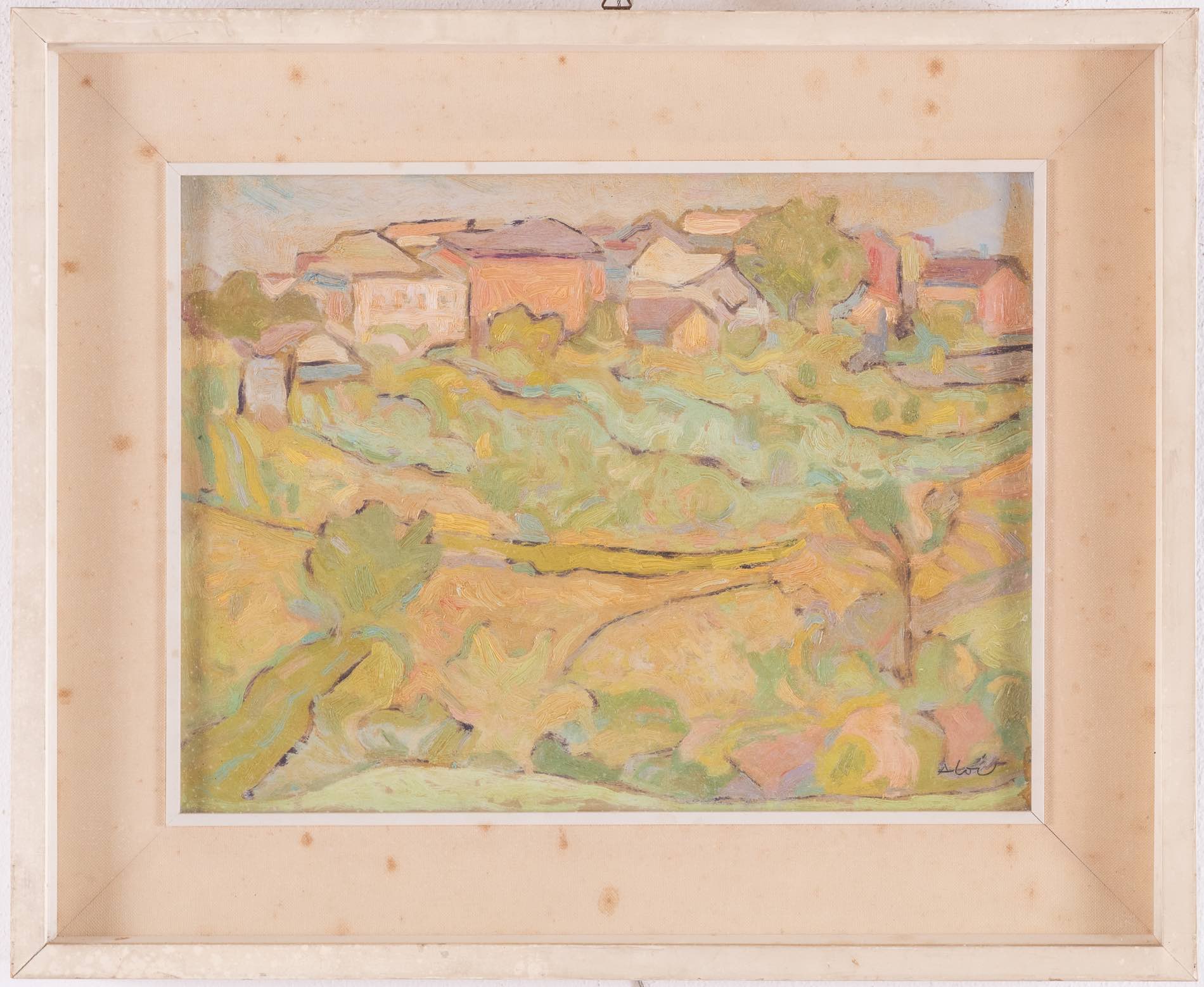 Roberto Aloi (Palermo 1897 - Berzo S. Fermo 1981), “Paesaggio con case”. Olio su tavola, firmato in basso a destra Aloi, al retro reca firma Roberto Aloi, H cm 30x40 - con cornice H cm 44x54