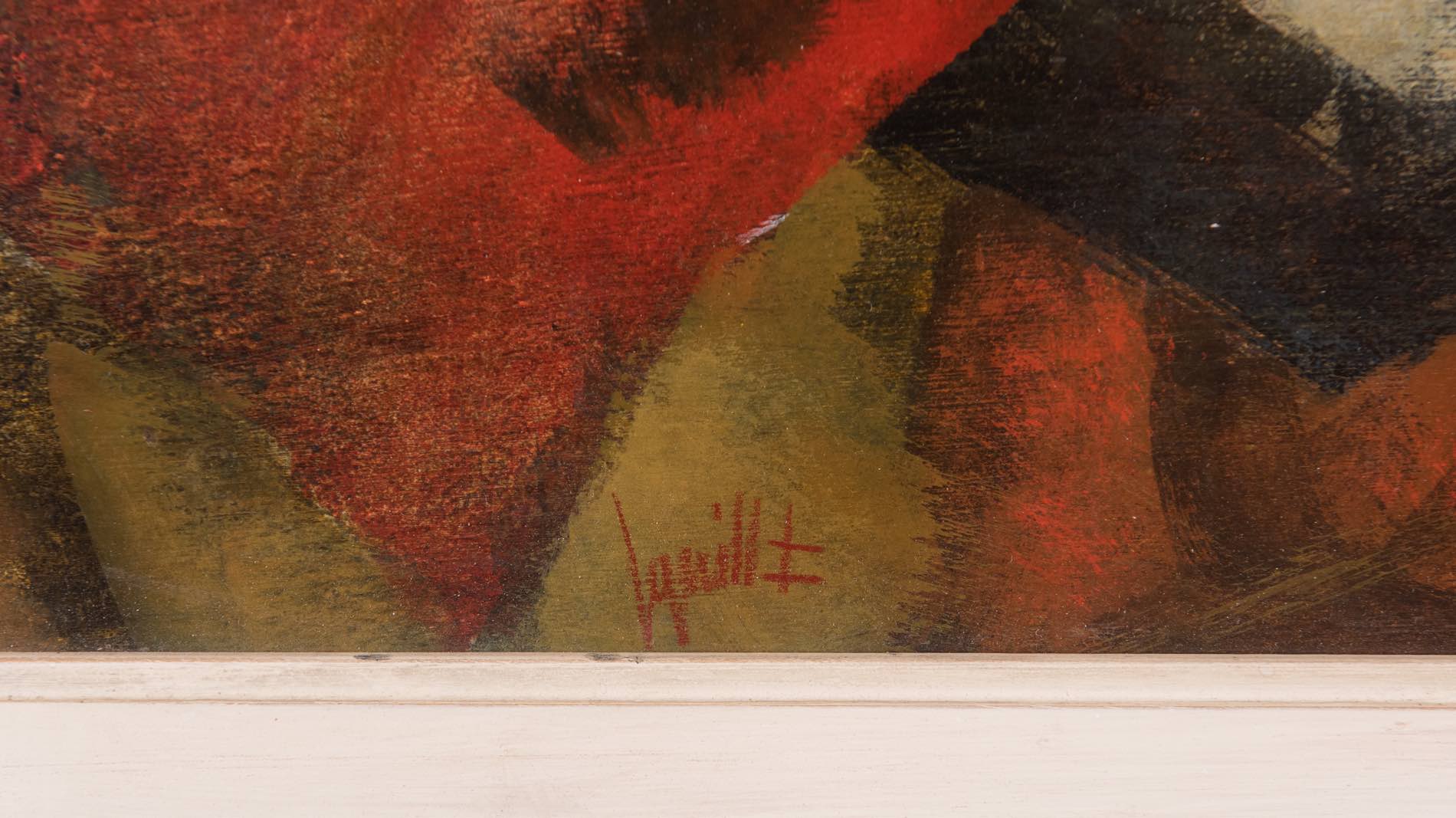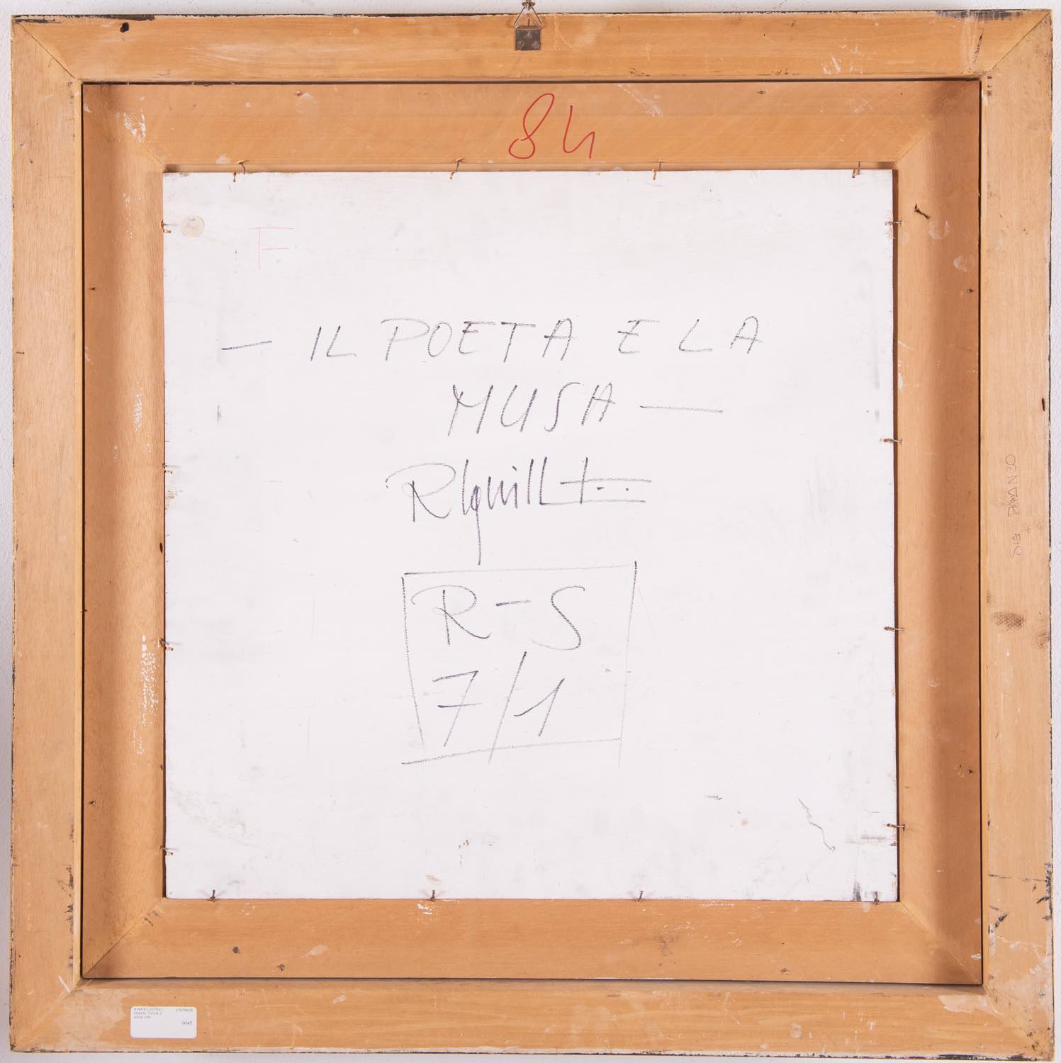 Remo Squillantini (Stia 1920 - Firenze 1996), “Il poeta e la musa”, 1991. Olio su tavola, firmato in basso a sinistra Squillantini, al retro reca titolo, firma e iscrizione 'Il poeta e la/musa/Squillantini/R-S 7/1', H cm 60x60 - con cornice H cm 85x85 - Opera esposta alla Mostra Antologica del 1991 a cura della Galleria d'Arte Russo e Russo - Fiuggi come da certificato di autenticità. Bibliografia di riferimento: opera pubblicata in 'Squillantini' Ed. Corbelli, p. 61, n. 26 come da certificato di autenticità.