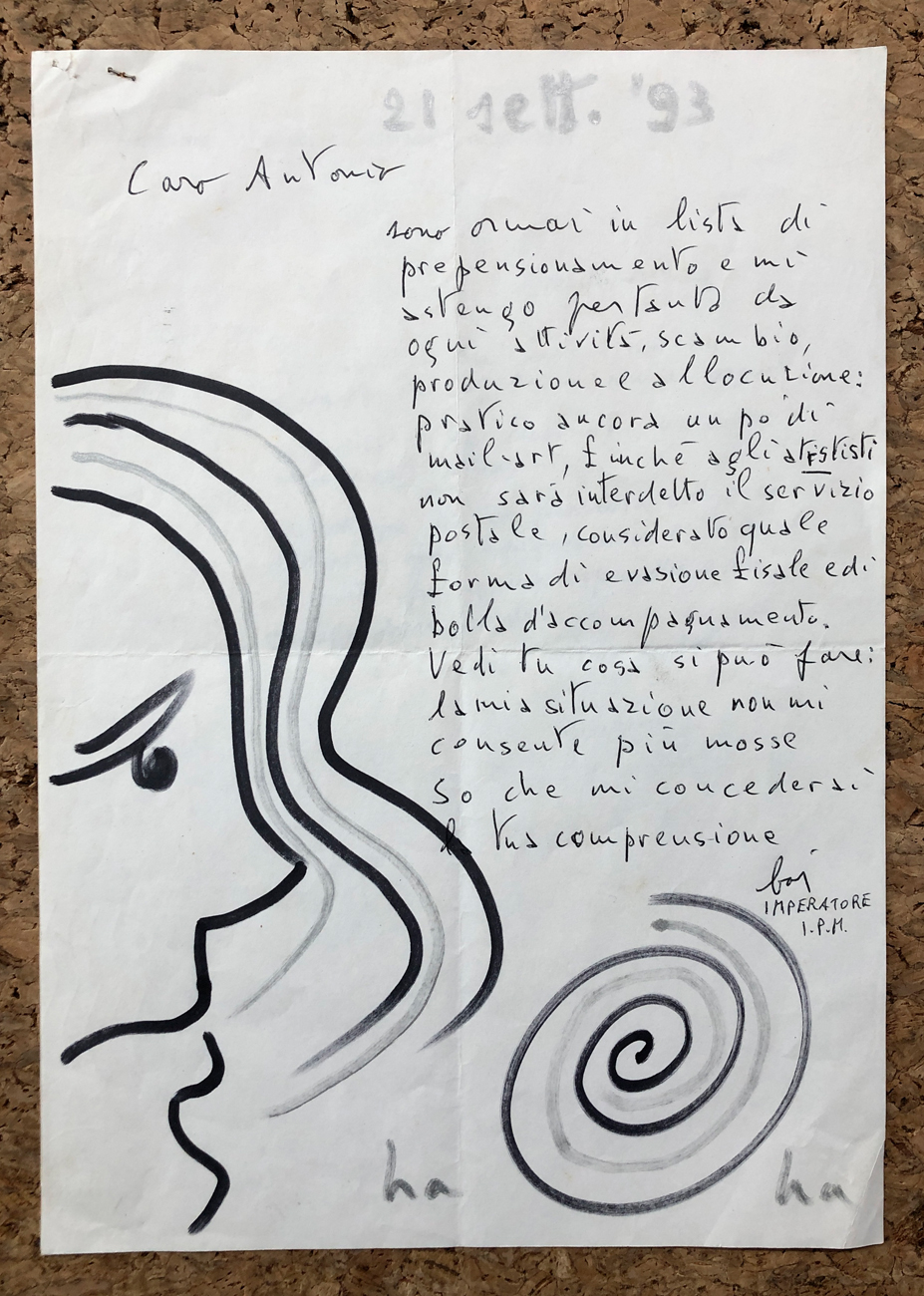 Lettera manoscritta di Enrico Baj con disegno a pennarello in nero e argento, firmata e datata 21 Sett. '93