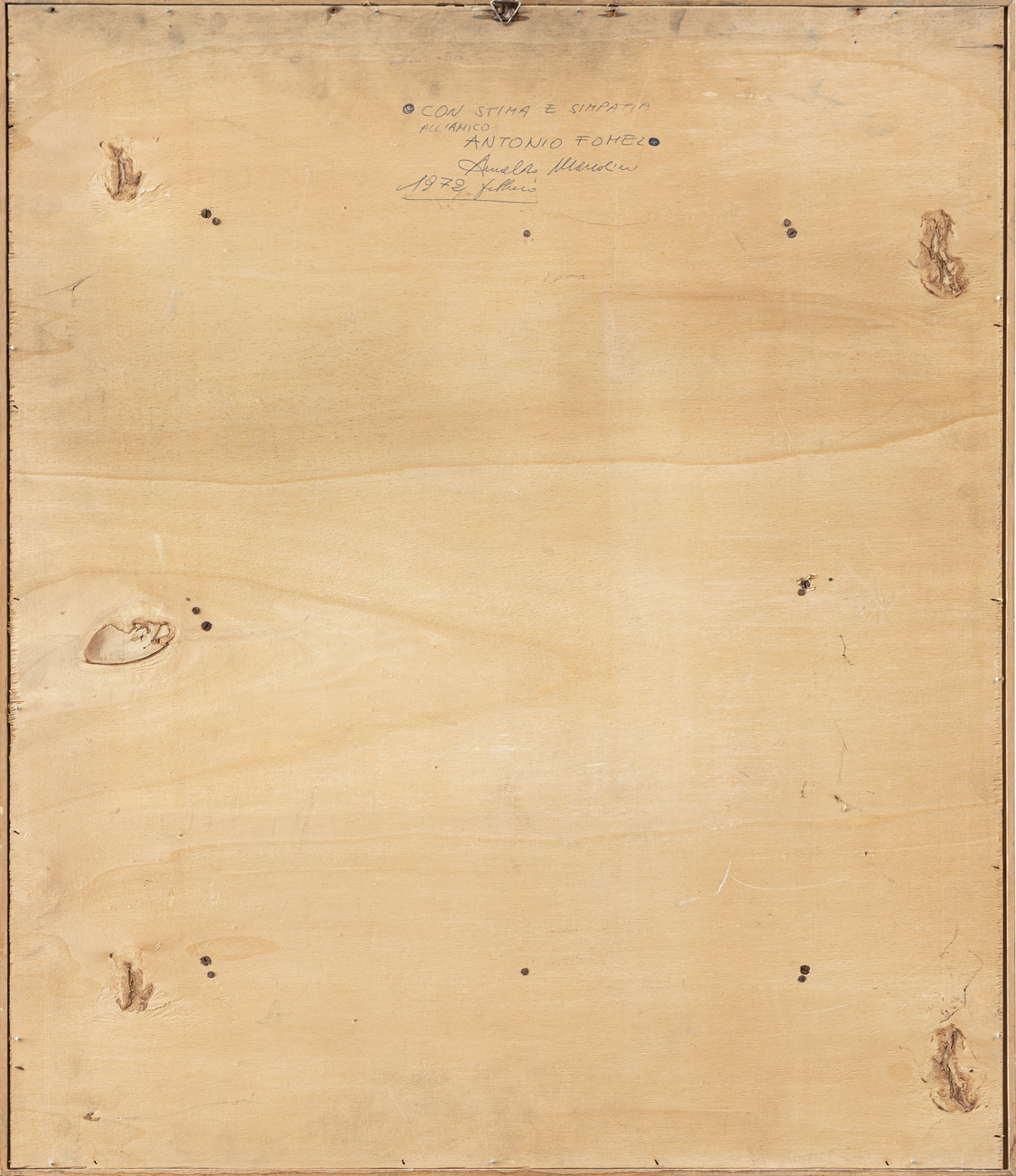 Firma, datazione e dedica ad personam al retro della tavola protettiva