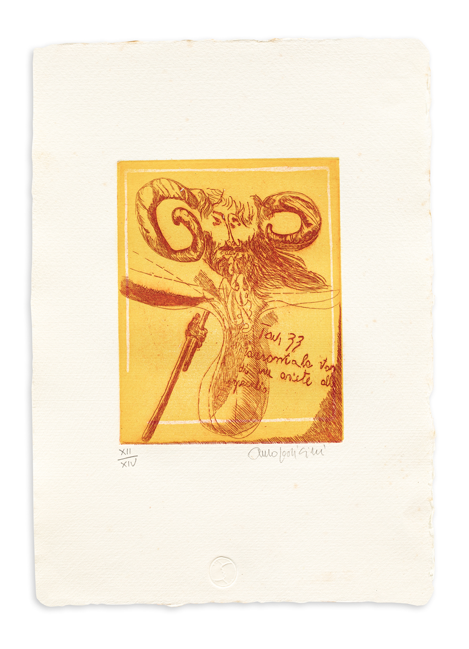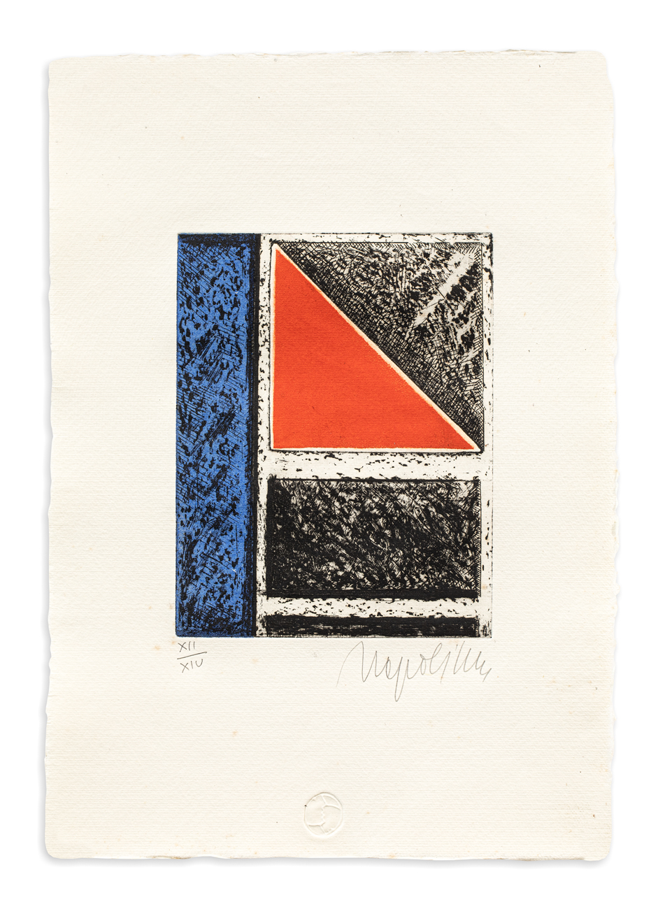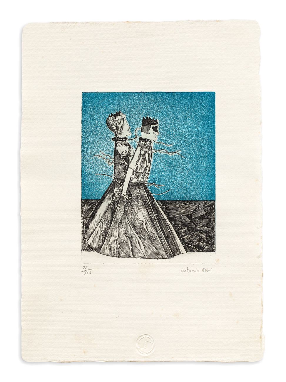 Cartella contenente testo di presentazione di Rita Felerico e 13 incisioni di Vittorio Avella, Felice Bifulco, Geppino Cilento, Pasquale Coppola, Vincenzo De Simone, Salvatore Emblema, Antonio Fomez, Antonio Napolitano, Annibale Oste, Aulo Pedicini, Mario Persico, Antonio Petti, Errico Ruotolo e Andrea Sparaco, ciascuna recante firma e numerazione (Esemplari XII/XIV) a matita al fronte