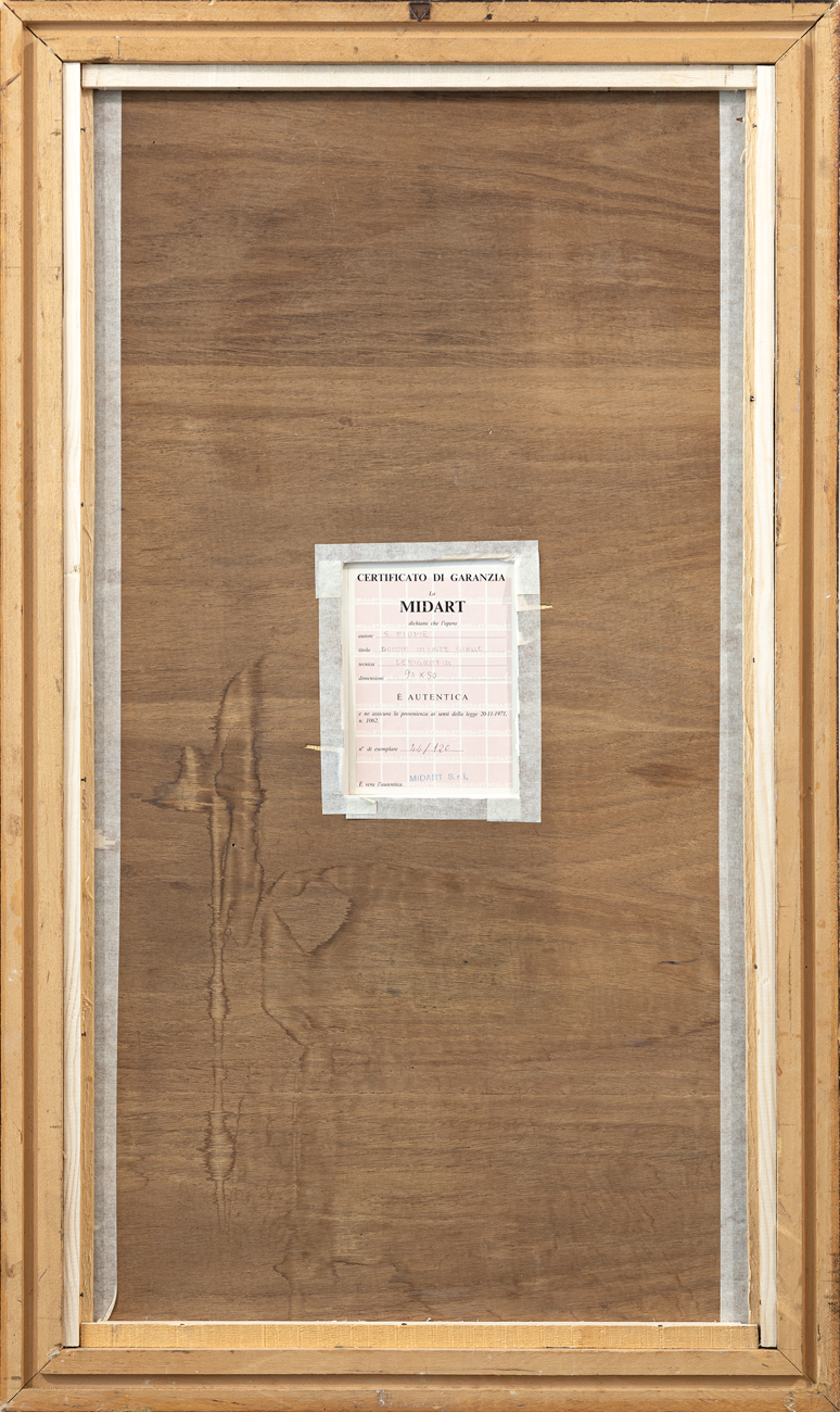 Certificato di garanzia e provenienza della Galleria Midart (MB) al retro del cartone protettivo