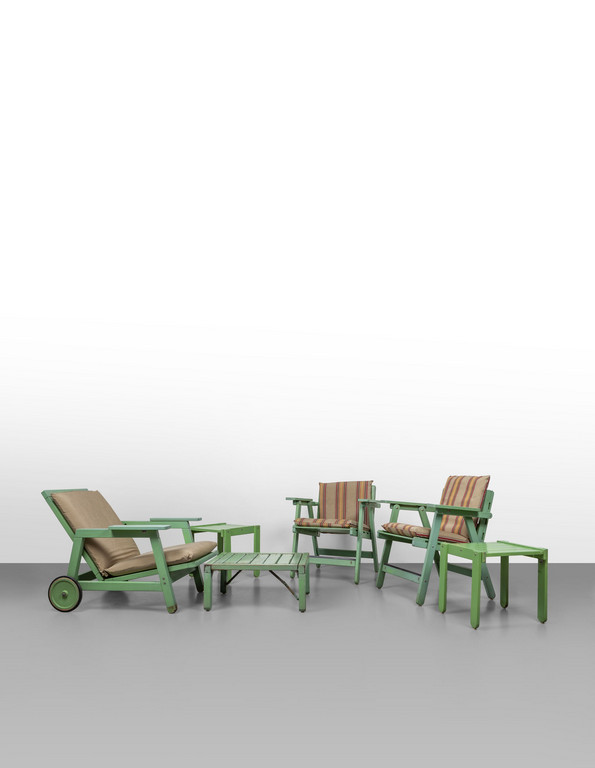 Due poltroncine piegevoli da giardino 'California' due tavolini e una chaise-longue da giardino con poggiapiedi 'Florida' per FRATELLI REGUITTI circa 1968.