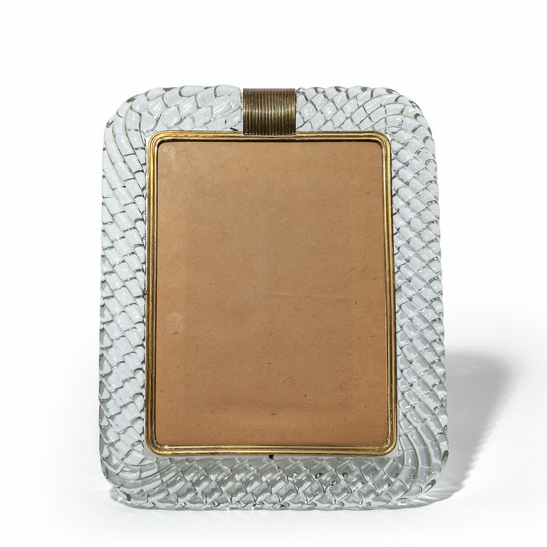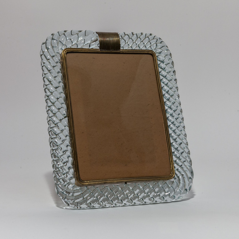 Un portaritratti in cristallo bluino ritorto e ottone.