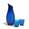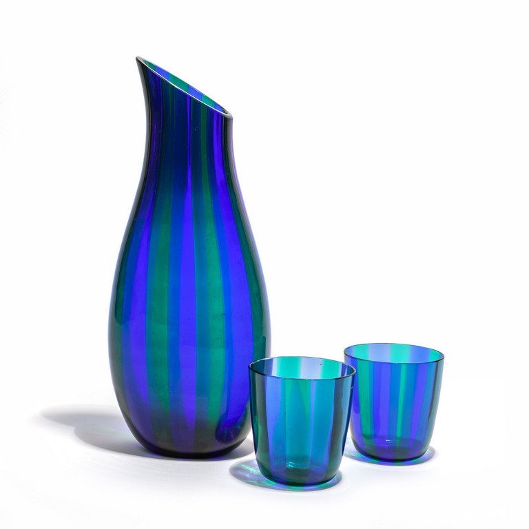Una caraffa e due bicchieri in vetro a canne trasparenti blu e verdi circa 1948.