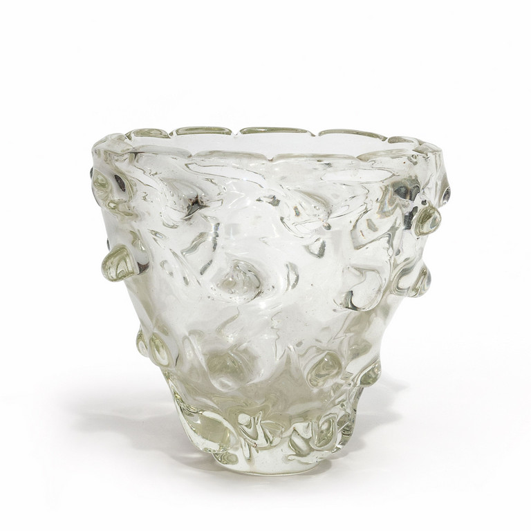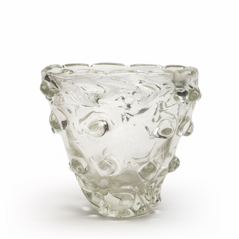 Un vaso in cristallo con bugne irregolari e bordo superiore segnato da solchi circa 1937.
