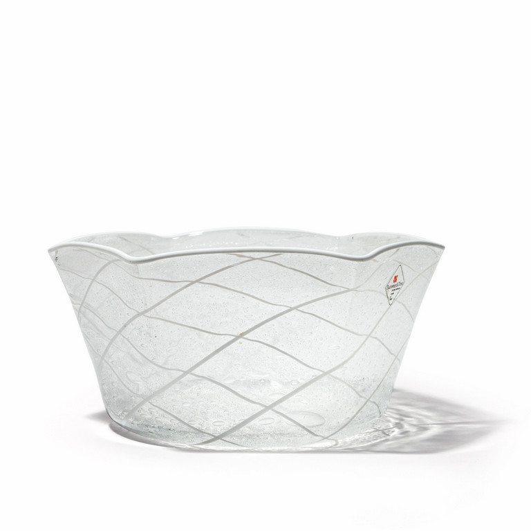 Una coppa esagonale in vetro 'efeso' con decoro di canne lattimo a rete circa 1975.
