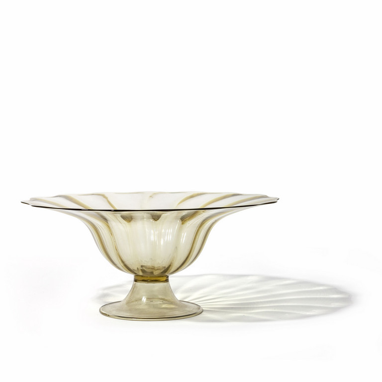Una coppa costolata in vetro trasparente verde oliva chiaro circa 1930.
