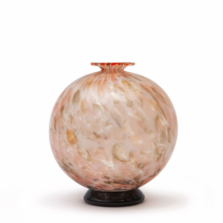 Un vaso sferico in cristallo a macchie colorate e avventurina con piede in pasta vitrea nera circa 1930.