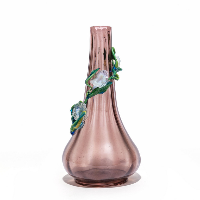Un vaso costolato ametista trasparente con applicazione di tralcio fiorito in paste vitree colorate circa 1920.