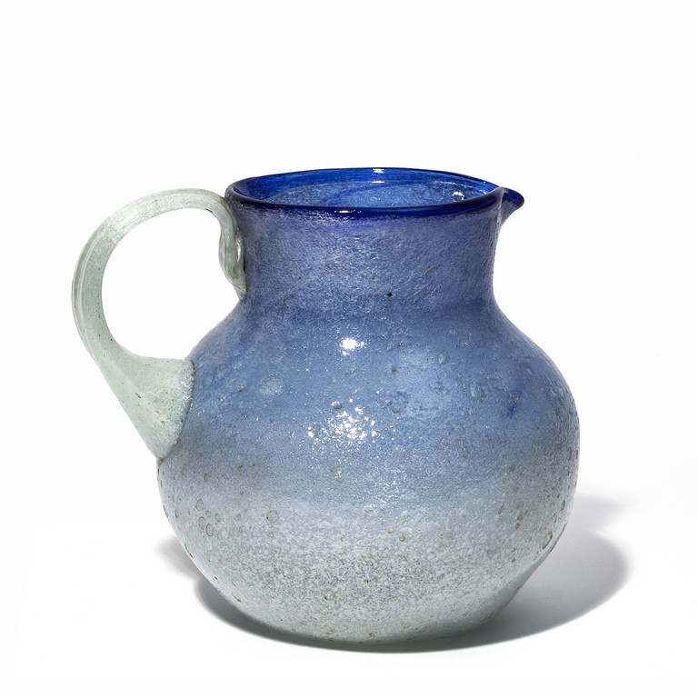 Una brocca in vetro pulegoso lattimo sfumato con bordo collo in azzurro circa 1930.