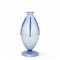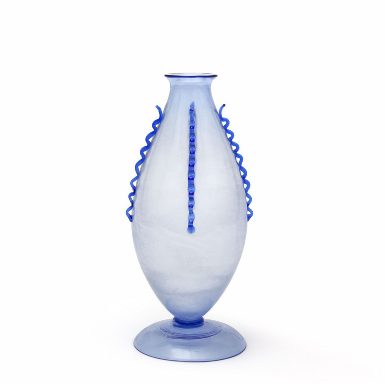 Un vaso a goccia in vetro bluino trasparente con quattro ansette ondulate applicate circa 1925.