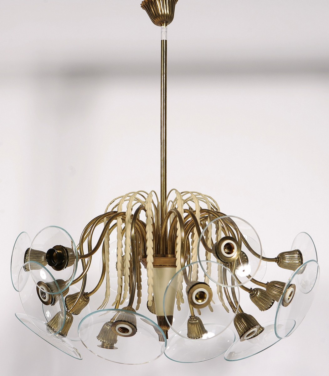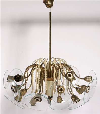 MANIFATTURA ITALIANA DEL XX SECOLO Coppia di lampadari. Metallo e vetro. Cm 75,00 x 86,00. Anni '50. Metallo con parti laccate e vetro.