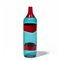 Una bottiglia in vetro trasparente verde decorata sul corpo da due fasce orizzontali rosse e collo rosso trasparente circa 1950.