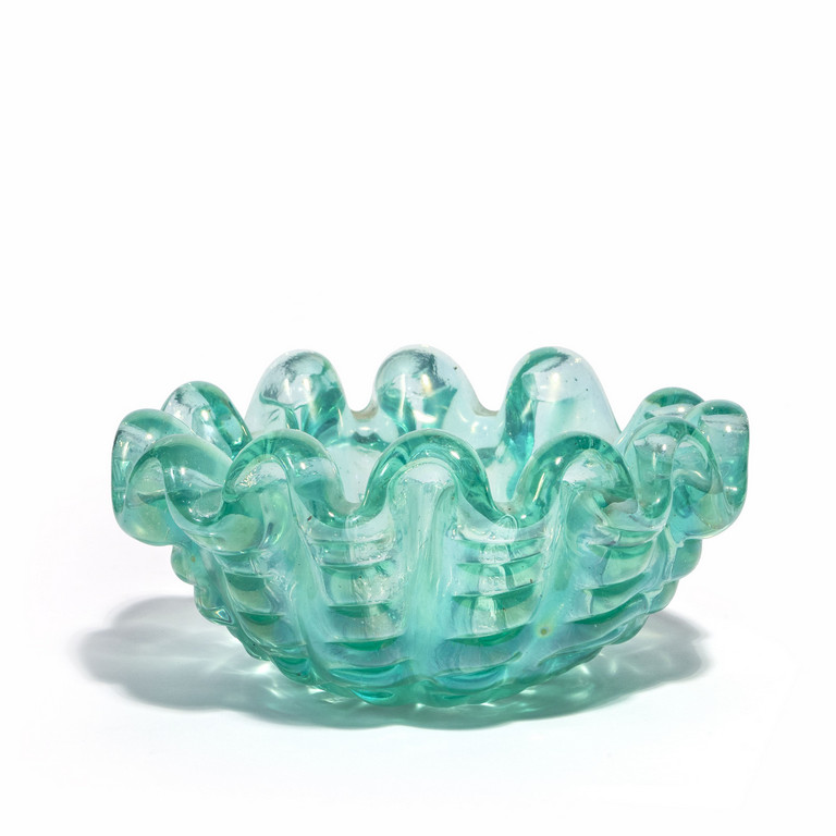 Una coppa ovale a conchiglia in vetro verdino circa 1942.
