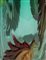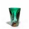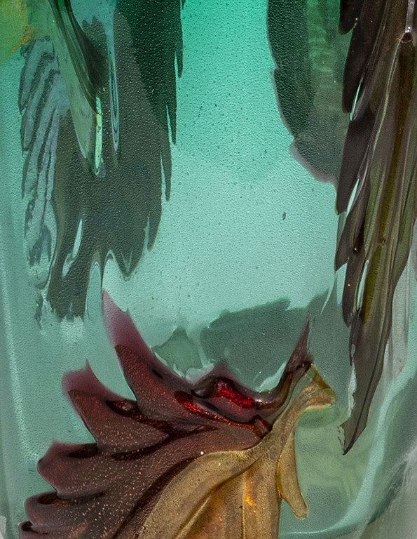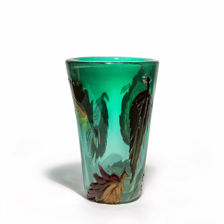 Un vaso in vetro verde sfumato con decoro di foglie sparse applicate.
