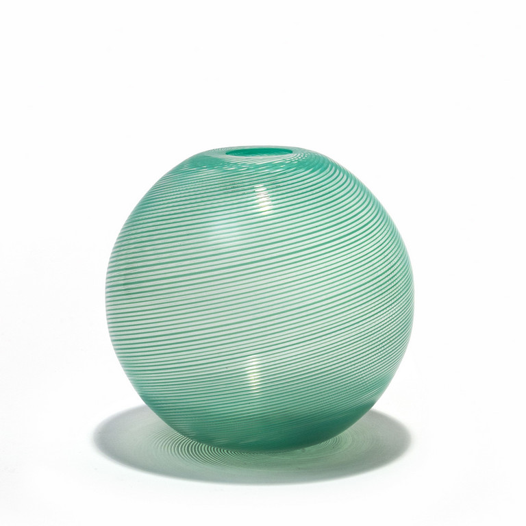 Un vaso sferico in vetro a mezza filigrana verde 1984 Marca incisa 'venini italia 84'.