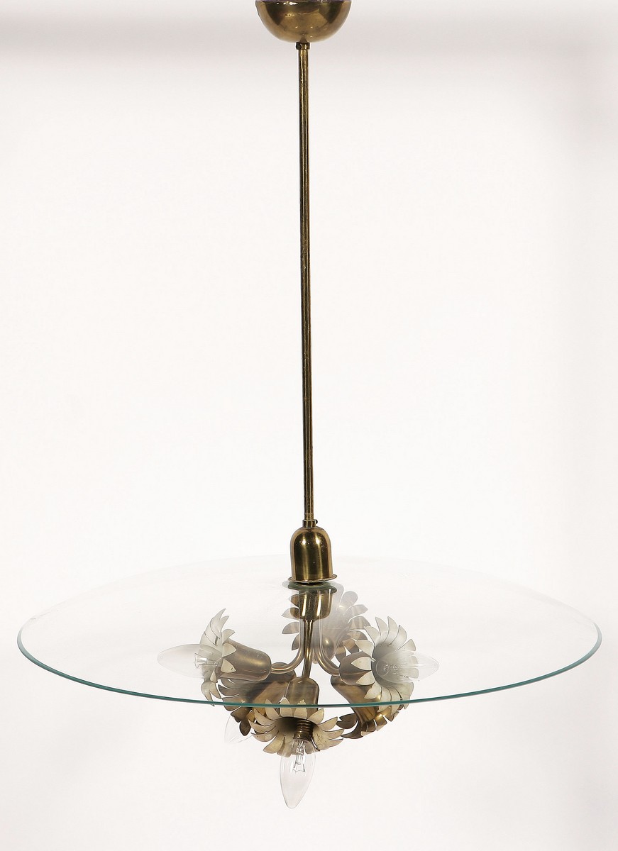 INGRAND MAX (1908 - 1969) Lampadario. Ottone e vetro. Cm 62,00 x 76,00....