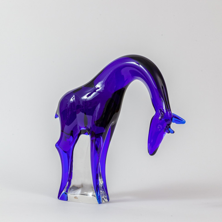 Una figura di giraffa in vetro blu con basamento in cristallo circa 1970.